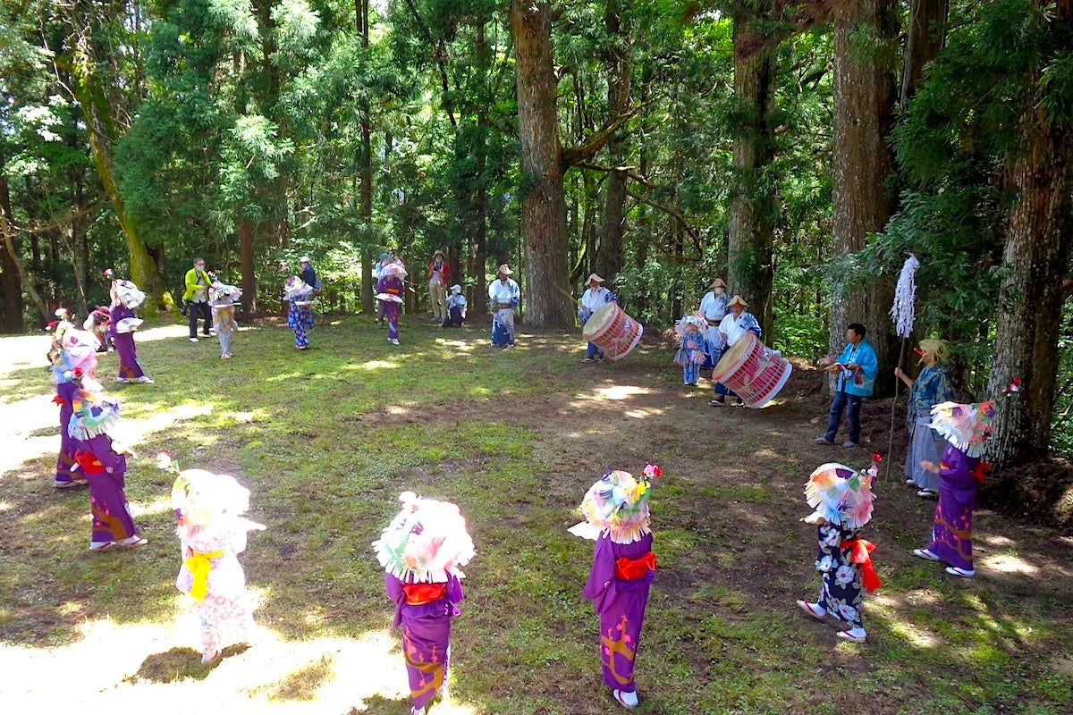 2023年も8月11日に奉納予定の神代踊。山深い濃い緑の中、鉦、太鼓、そして歌が響き渡り、色鮮やかな花笠や衣装をまとった踊り手が舞う様子は圧巻です。