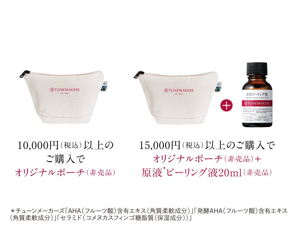 10,000円(税込)以上ご購入の方に【オリジナルポーチ】、15,000円(税込)以上ご購入の方に【オリジナルポーチ+「原液*10ピーリング液(20ml)」】をプレゼント!