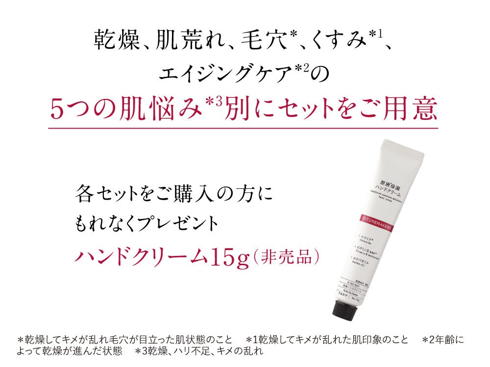 乾燥、肌荒れ、毛穴*3、くすみ*4、エイジングケア*5の5つの肌悩み*別に、お得な特別セットをご用意。各セットをご購入していただいた方にはもれなく、手肌の乾燥・手荒れを防ぎながら、爪トラブルの原因となる爪の乾燥までケアできる「原液*6保湿ハンドクリーム サンプル(15g)」をプレゼントいたします。