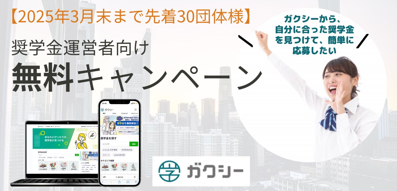 【ガクシー】奨学金運営者向けに、オンライン応募化・応募増を「無料」で支援!学生・保護者へ給付型奨学金(返済不要)の認知拡大と利用促進に貢献