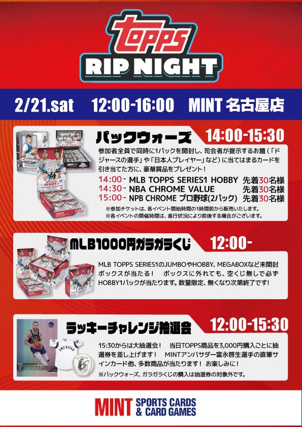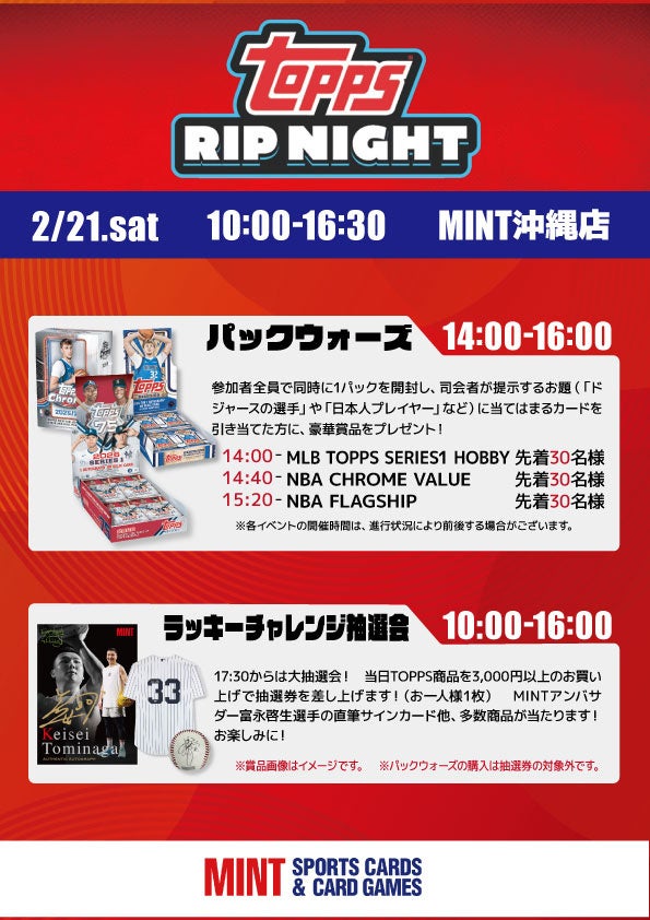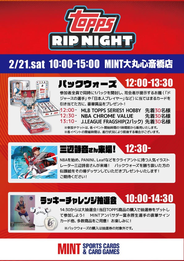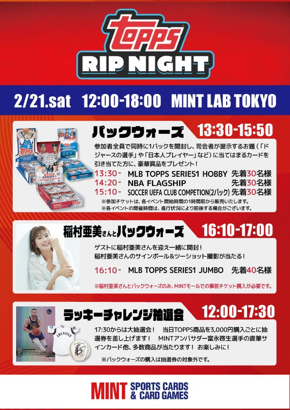スポーツトレーディングカードにおける大人気イベント「Topps Rip Night 2026」が、2026年2月21日(土)に東京・大阪・名古屋・沖縄のミント店舗にて開催されることが決定いたしました。