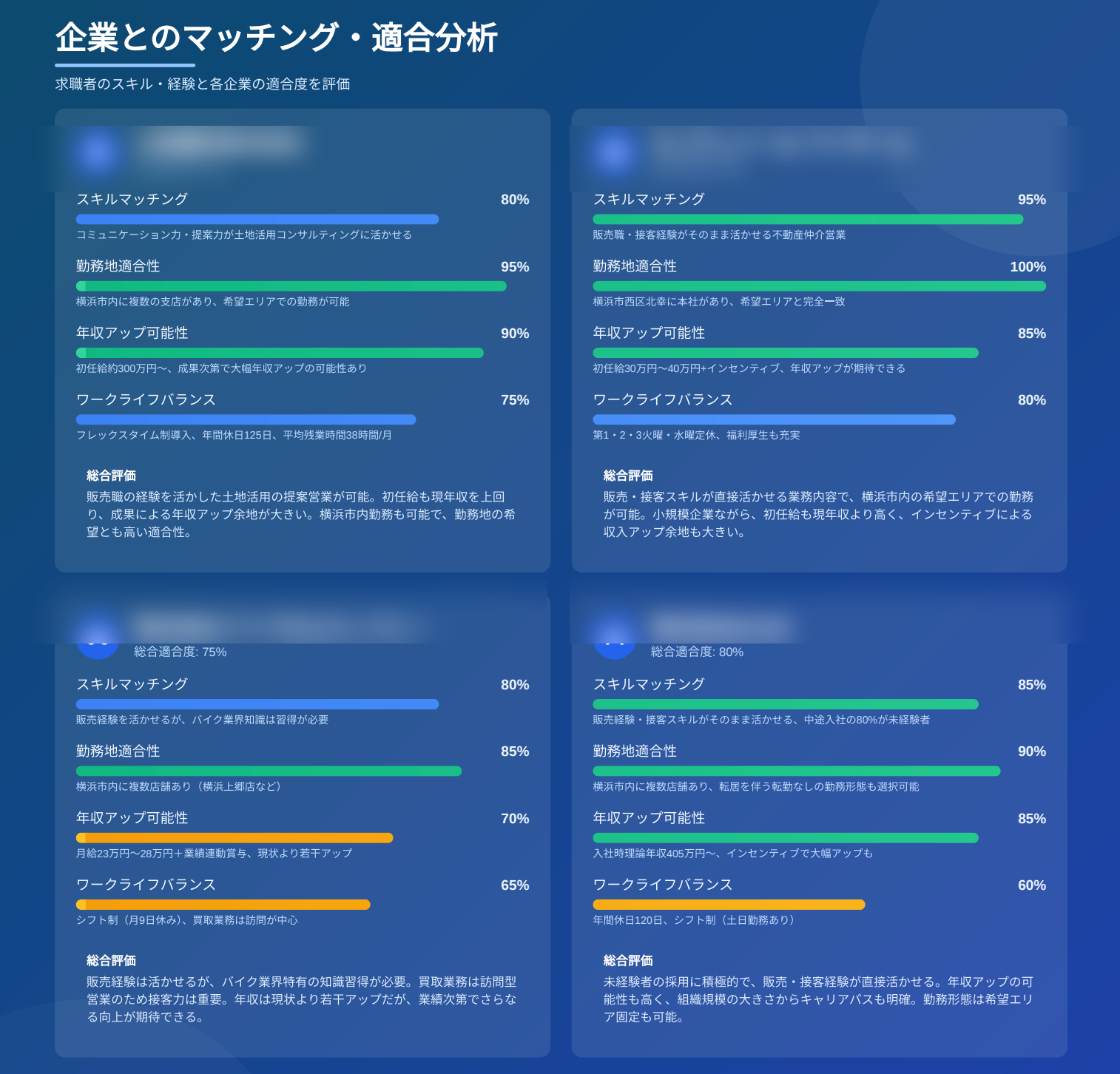 「体験入社動画」などで収集している「実際の仕事内容」「給与」「休日・残業」「社風・人間関係」などの"入社後のリアル"を元にAIが求職者にマッチングする求人企業を徹底的に分析します。