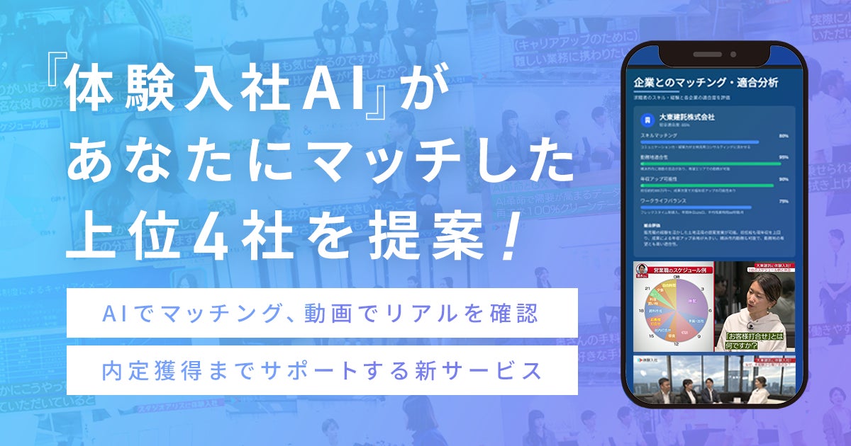 「体験入社動画」の導入は、「体験入社AI」をさらに効果的なものにします。「体験入社AI(https://media.taikennyusha.com/)」は、求職者の希望条件を元に、AI(人工知能)が最適な求人企業を分析してマッチングする新しい転職支援サービスです。