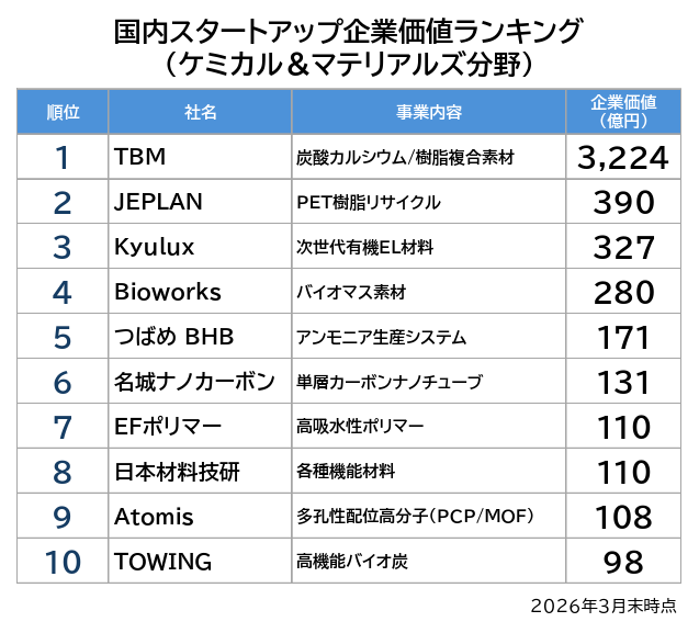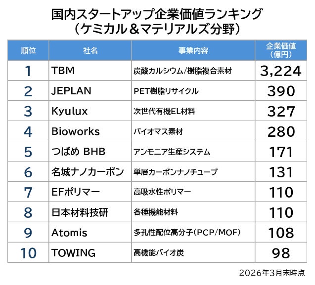 日本材料技研、ケミカル&マテリアルズ分野の国内スタートアップ企業価値ランキング(2026年3月)を公表