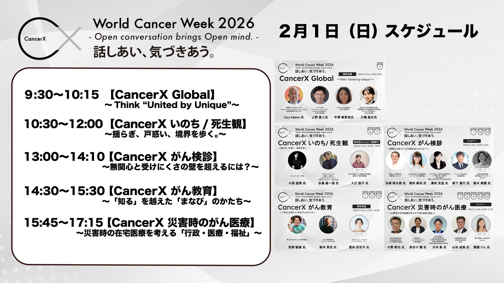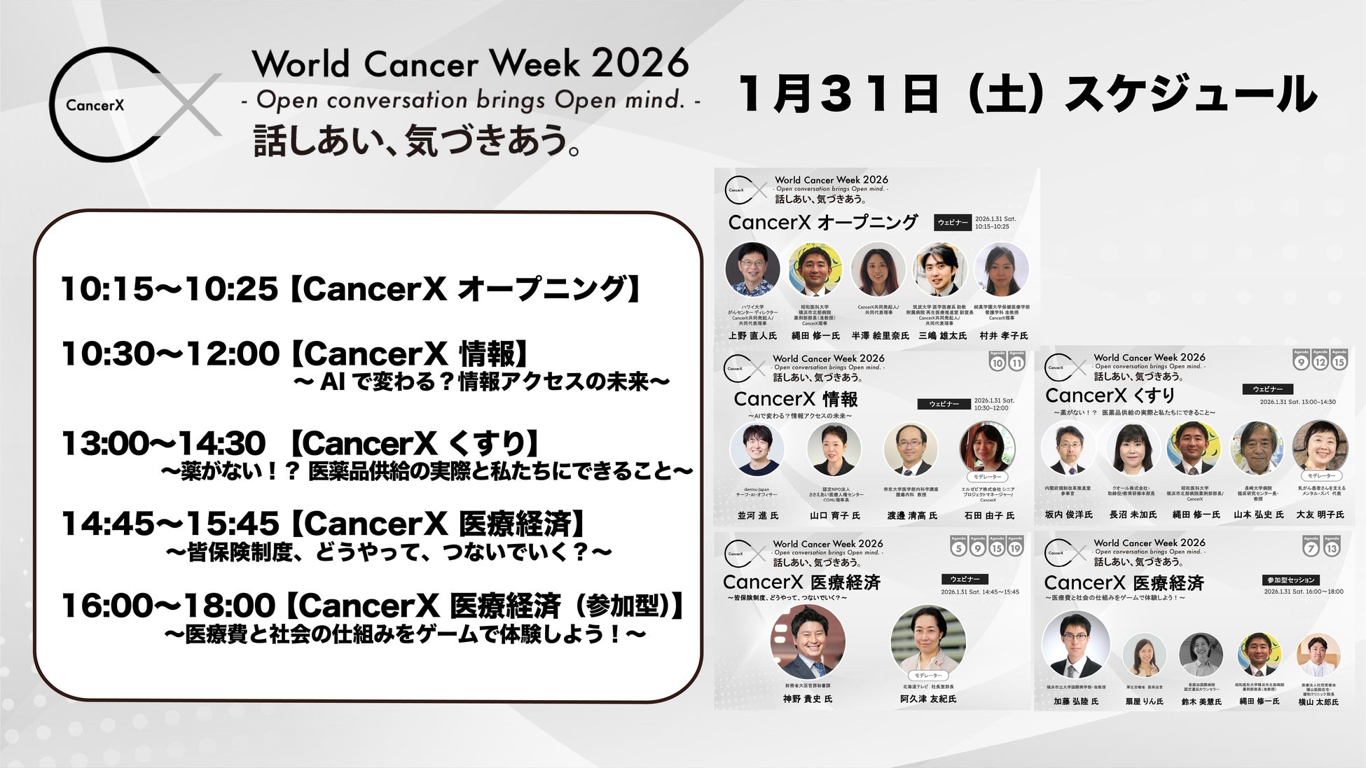 一般社団法人CancerX(共同代表理事:上野直人・半澤絵里奈・三嶋雄太)は、2026年1月31日(土)から2月4日(水)の5日間、がんに関わる社会課題を議論するオンラインカンファレンス「World Cancer Week 2026(以下、WCW2026)」を開催し、1,000名以上の参加者とともに全日程を終了いたしました