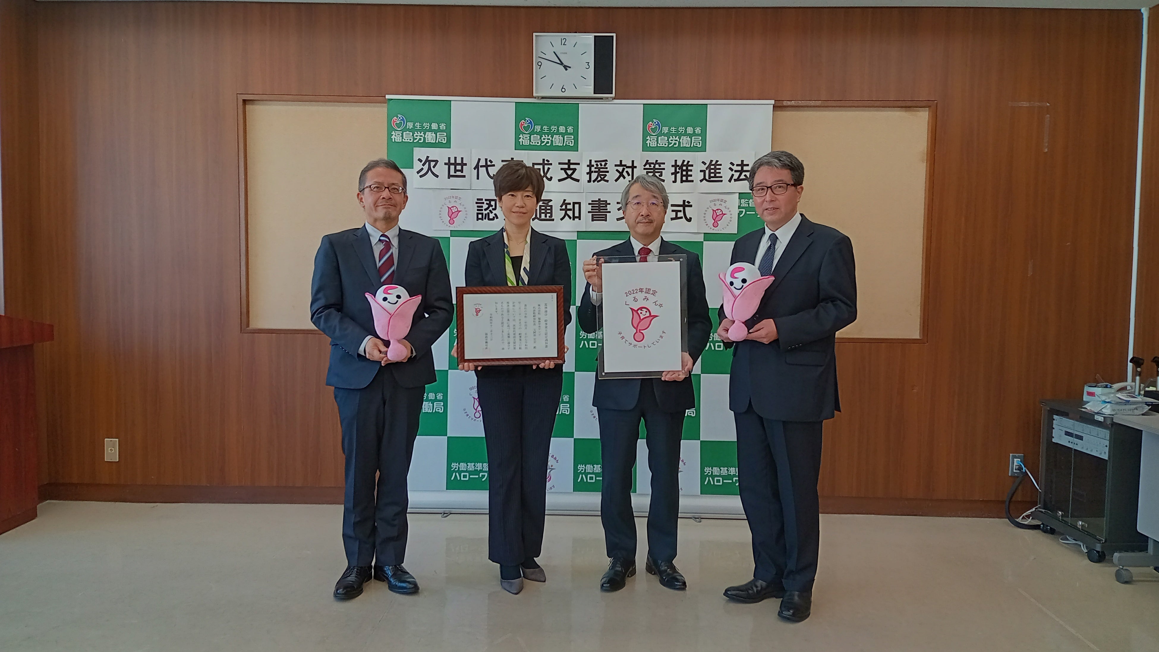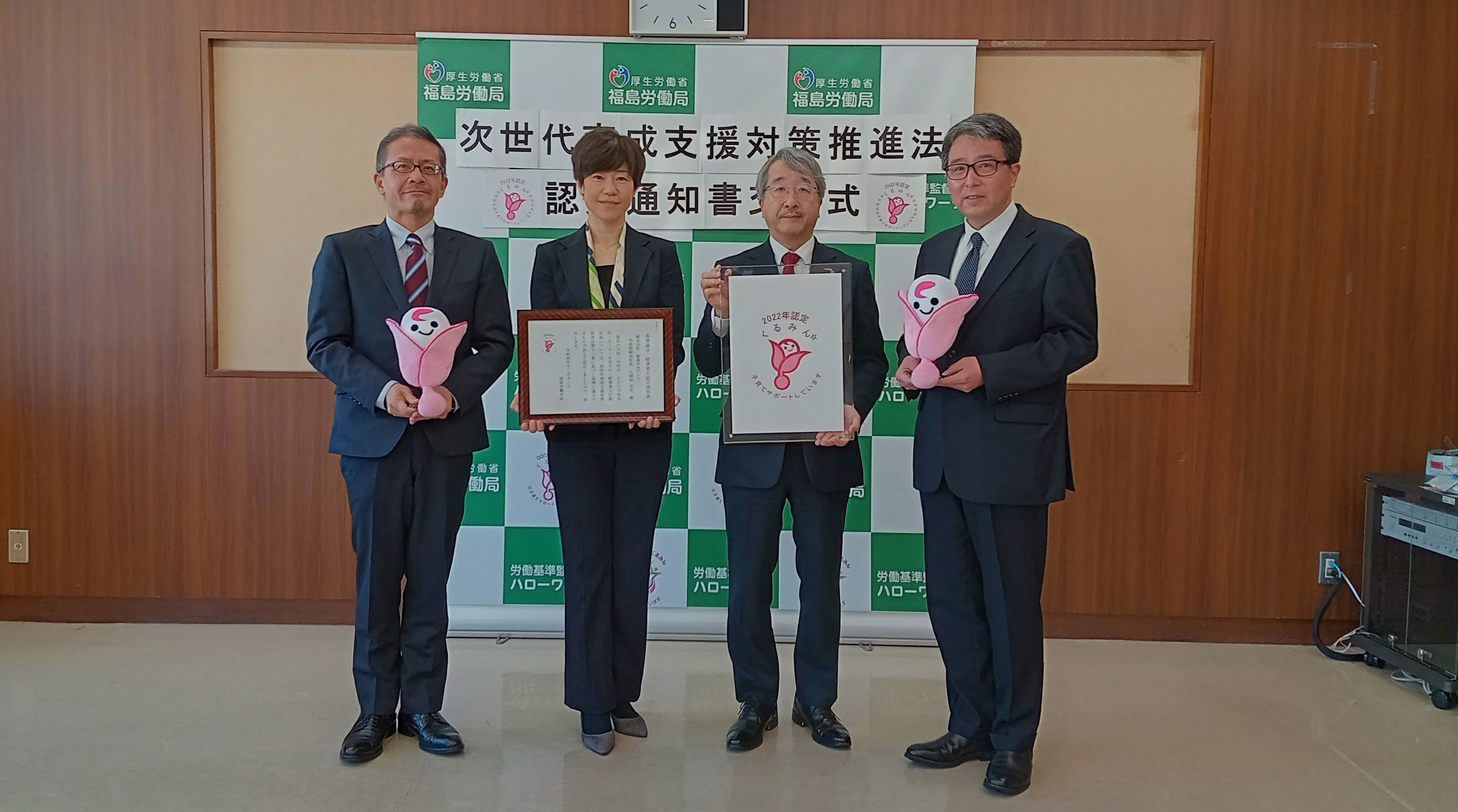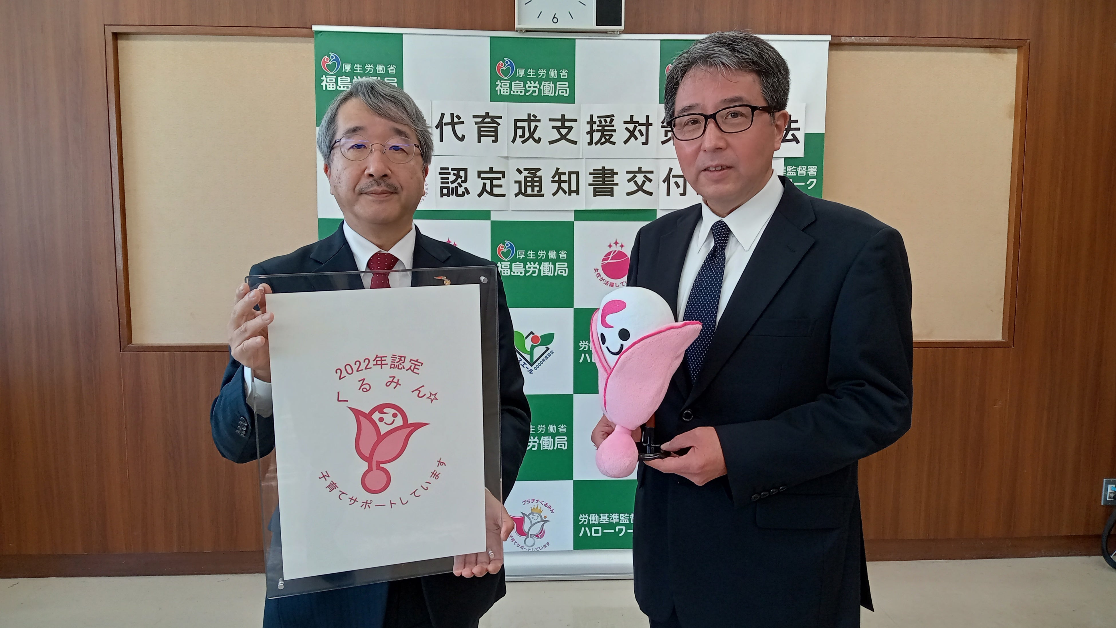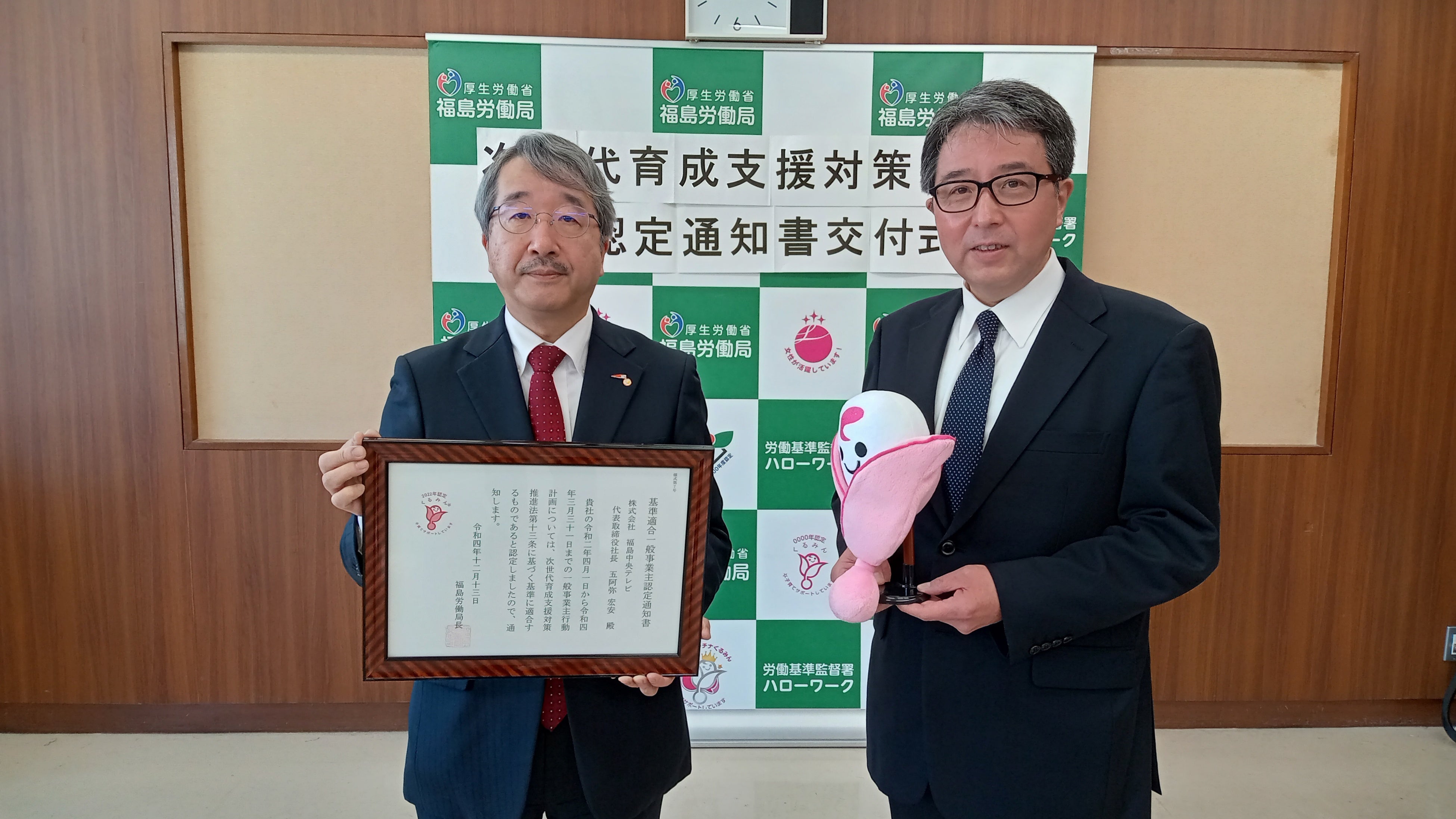 株式会社福島中央テレビ(本社:福島県郡山市/代表取締役社長:五阿弥宏安)は、子育てサポート支援企業として厚生労働省より「2022年くるみん認定」を受け、1月30日に福島労働局から認定通知書が交付されました。