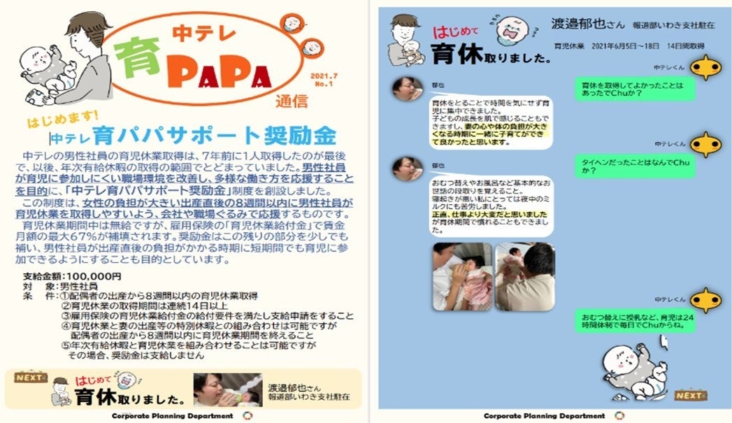 (2)育児休業制度の内容や男性社員の育児休業の取得事例を「見える化」して社内に周知することを目的にした広報誌「中テレ育PAPA通信」を作成し、男性社員の育児休業取得を積極的に呼びかけました。