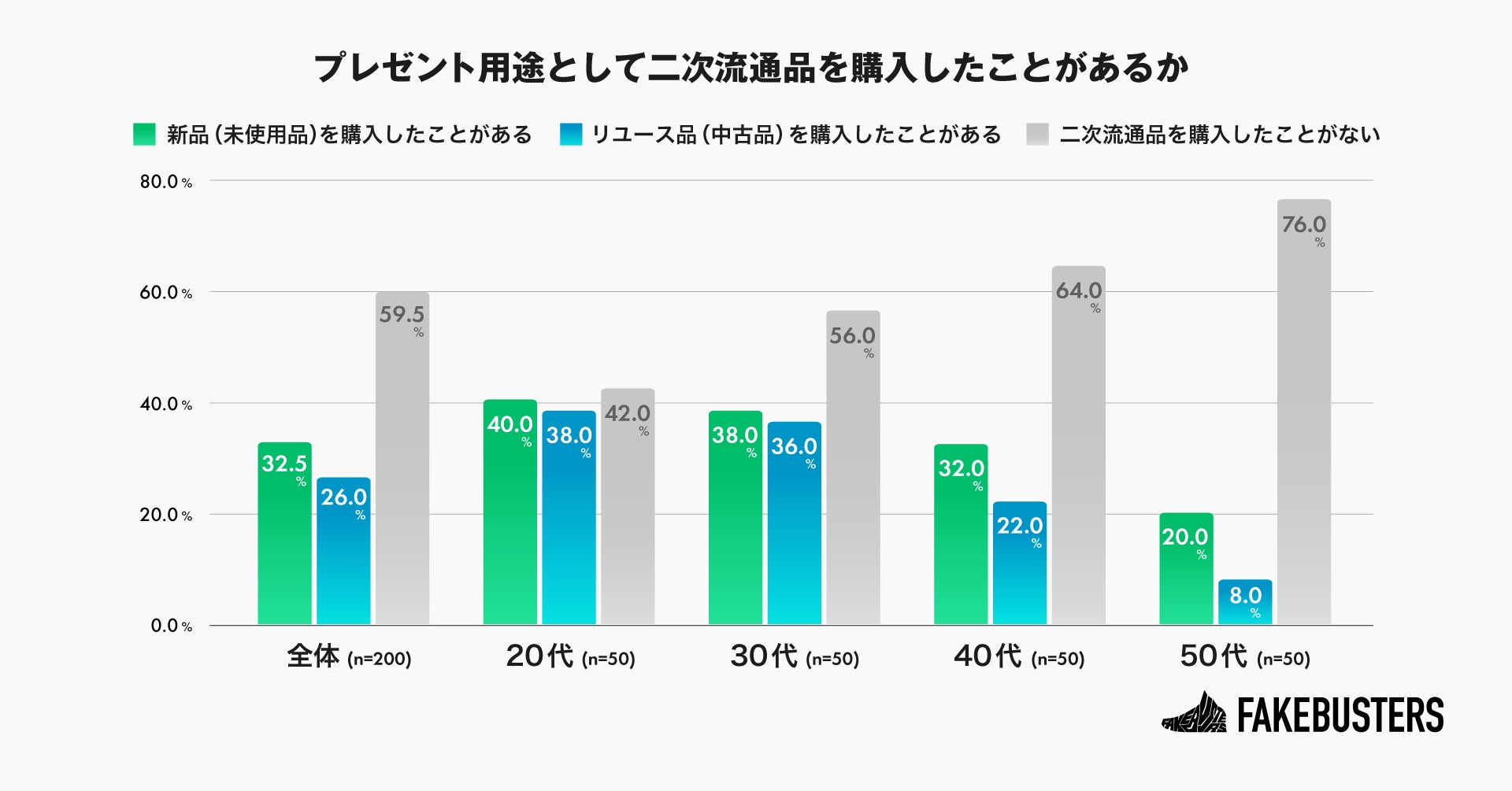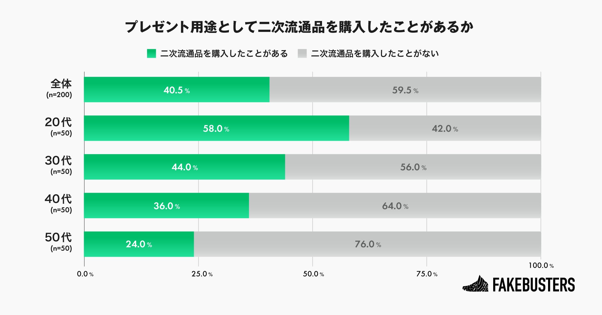 さらに、年代別に見ると、若い年代ほどプレゼント用途でリユース品を購入した経験がある割合が高いことがわかりました(n=200)。