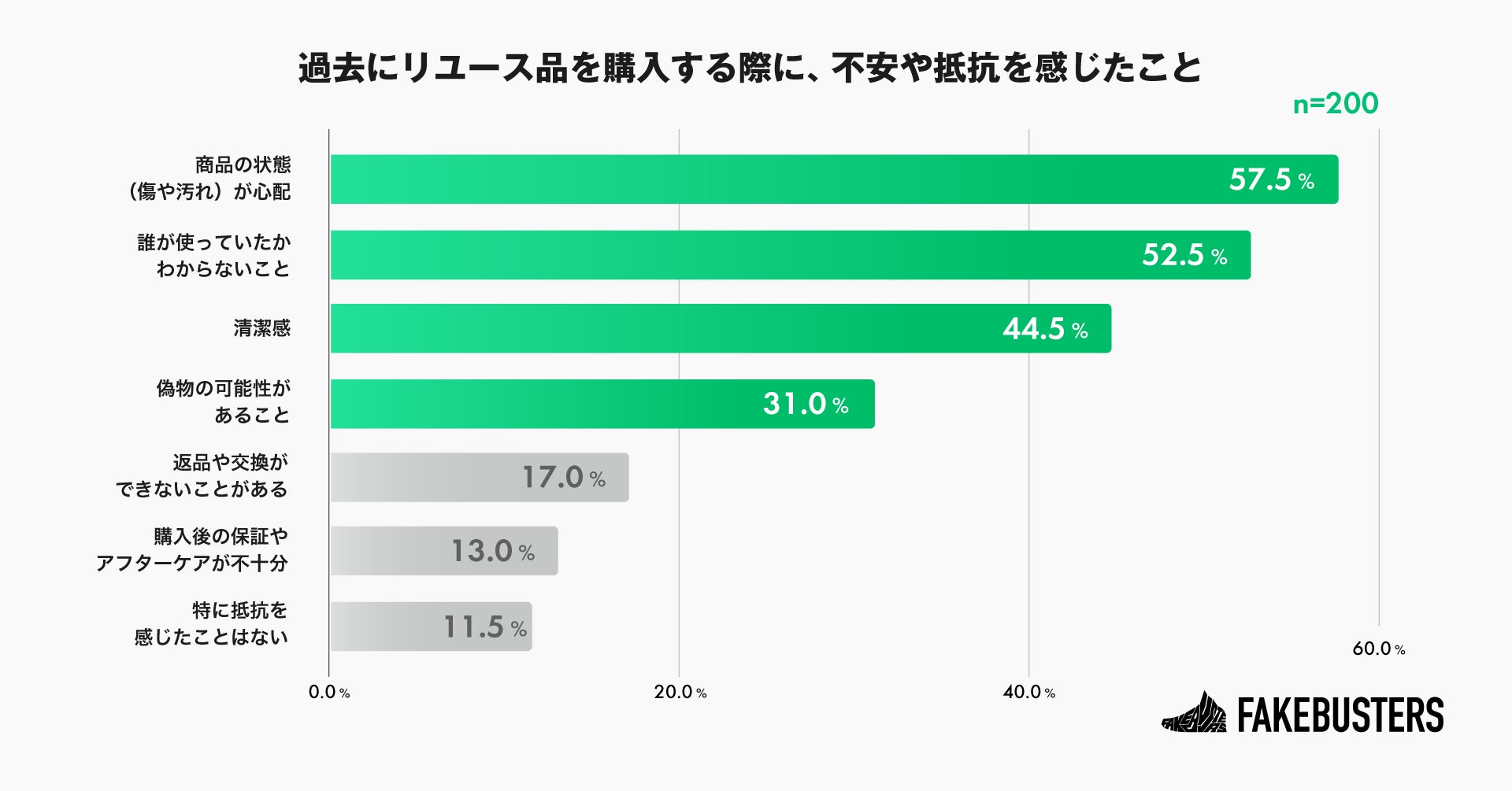 リユース品を購入する際に、不安や抵抗を感じたことを尋ねたところ、「商品の状態(傷や汚れ)」が57.5%で最も多く、「誰が使っていたかわからない」が52.5%、「清潔感」が44.5%と続きました(n=200)。