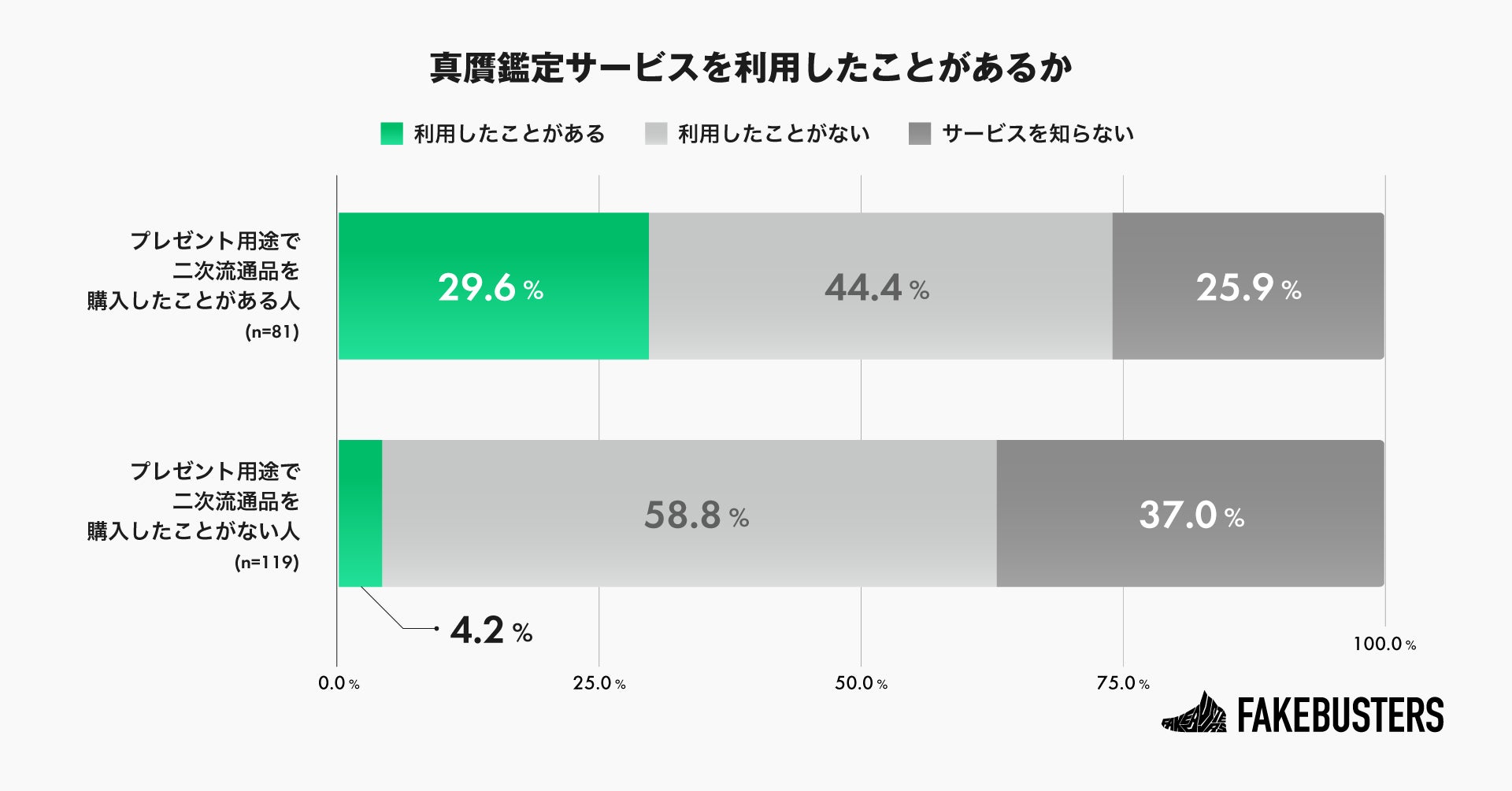 一方で、購入経験がない人は4.2%にとどまり、二次流通品のプレゼント購入経験がある人の方が、ない人に比べて25.4ポイント高い割合で真贋鑑定サービスを利用していることがことがわかりました(n=119/プレゼント用途で二次流通品を購入したことがない人)。