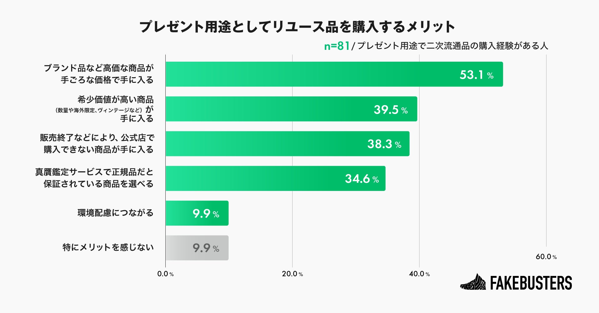 プレゼント用途としてリユース品を購入するメリットについて尋ねたところ、「ブランド品など高価な商品が手ごろな価格で手に入る」が53.1%と最も多く、「希少価値が高い商品が手に入る」が39.5%、「販売終了などにより、公式店で購入できない商品が手に入る」が38.3%と続きました(n=81/プレゼント用途で二次流通品の購入経験がある人)。