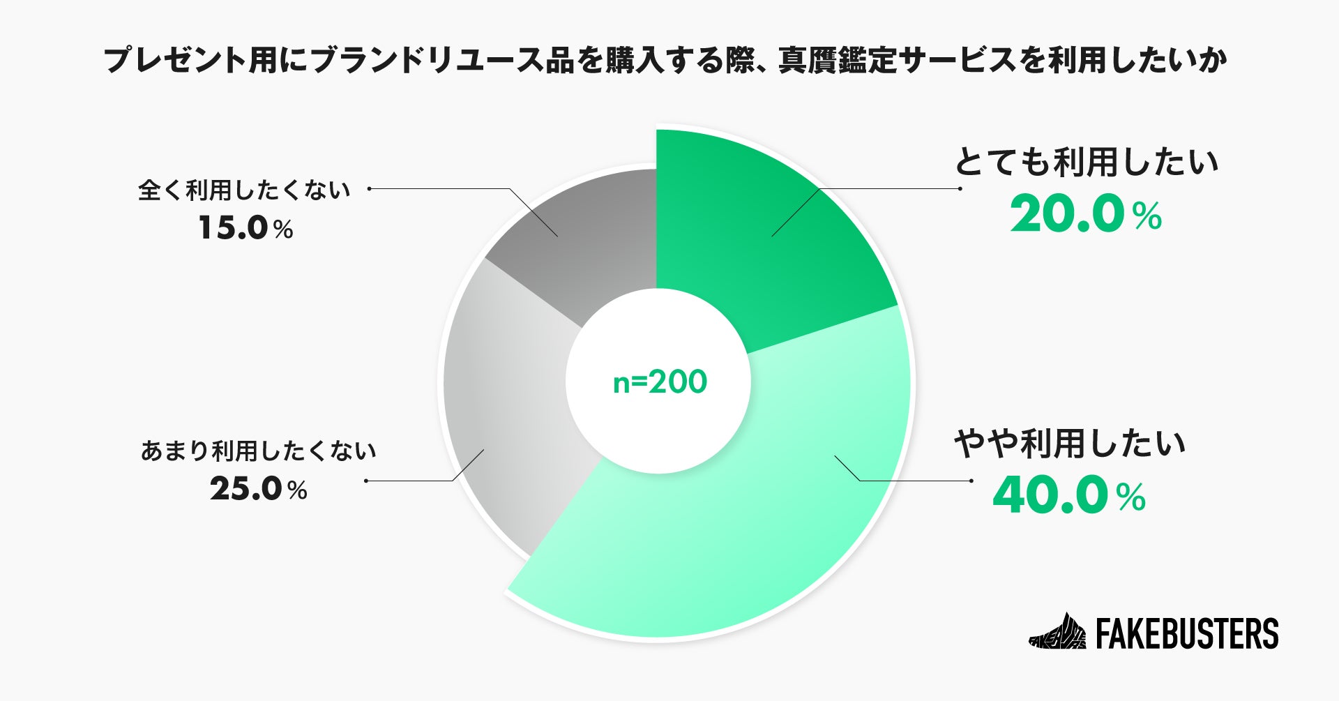 プレゼント用にブランドリユース品を購入する際、真贋鑑定サービスを利用してみたいと思うか尋ねたところ、「とても利用したい」が20.0%、「やや利用したい」が40.0%で、合わせて6割が利用したいと回答しました(n=200)。