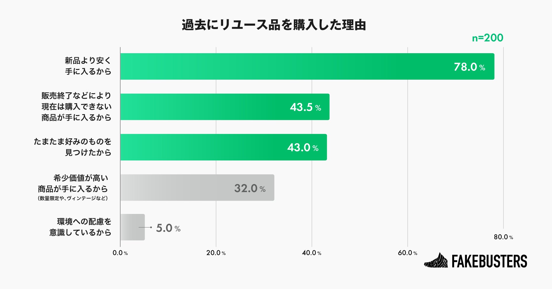 過去にリユース品を購入した理由を尋ねたところ、「新品より安く手に入るから」が78.0%と最も多く、「販売終了などにより現在は購入できない商品が手に入るから」が43.5%、「たまたま好みのものを見つけたから」が43.0%と続きました(n=200)。