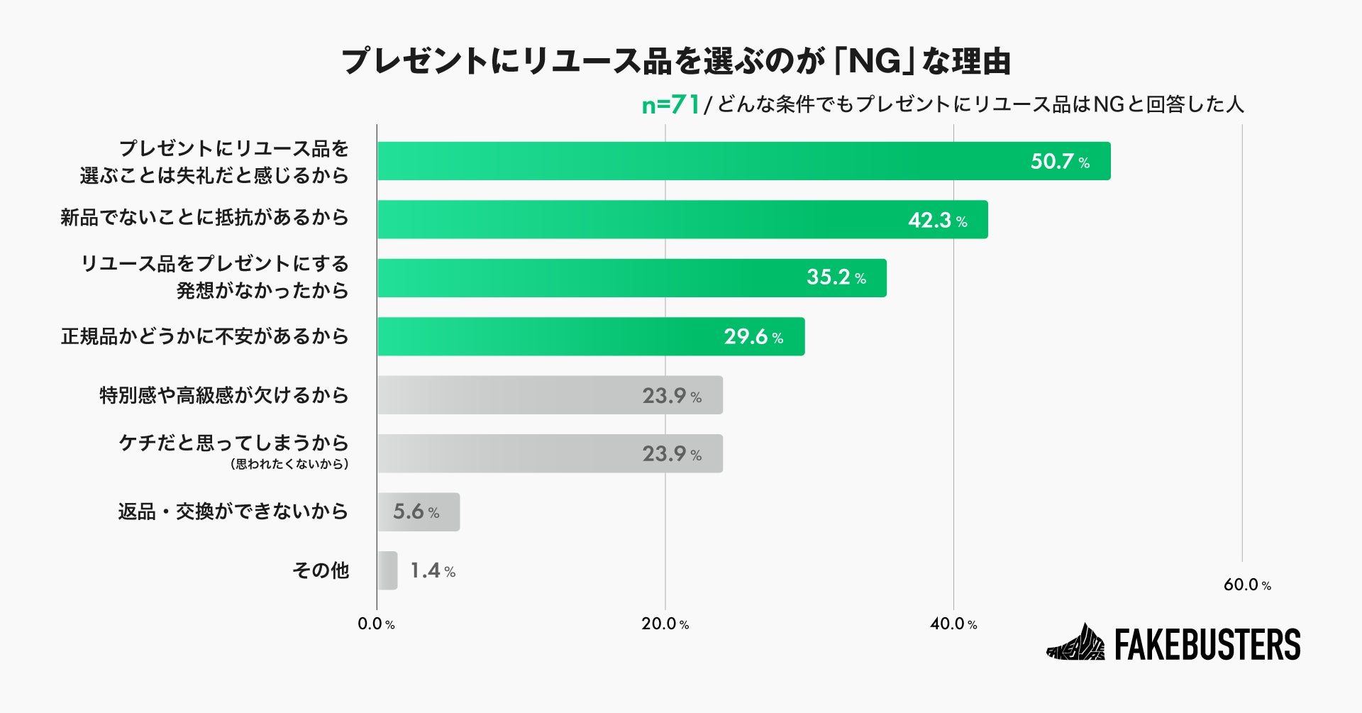プレゼントにリユース品を選ぶのが「NG」な理由を尋ねたところ、「失礼だと感じるから」が50.7%で最も多く、「新品でないことに抵抗があるから」が42.3%、「リユース品をプレゼントにする発想がなかったから」が35.2%と続きました(n=71/どんな条件でもプレゼントにリユース品はNGと回答した人)。