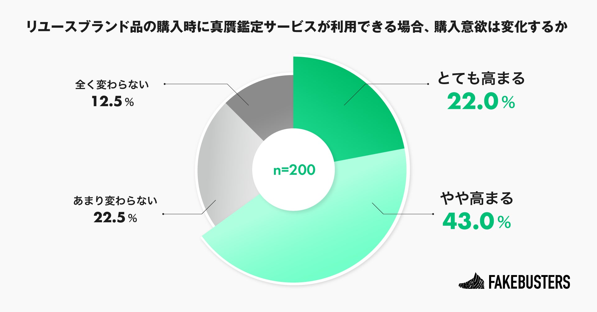 リユースブランド品の購入時に真贋鑑定サービスが利用できる場合、購入意欲が変わるか尋ねたところ、「とても高まる」が22.0%、「やや高まる」が43.0%で、合わせて約7割が購入意欲が高まると回答しました(n=200)。