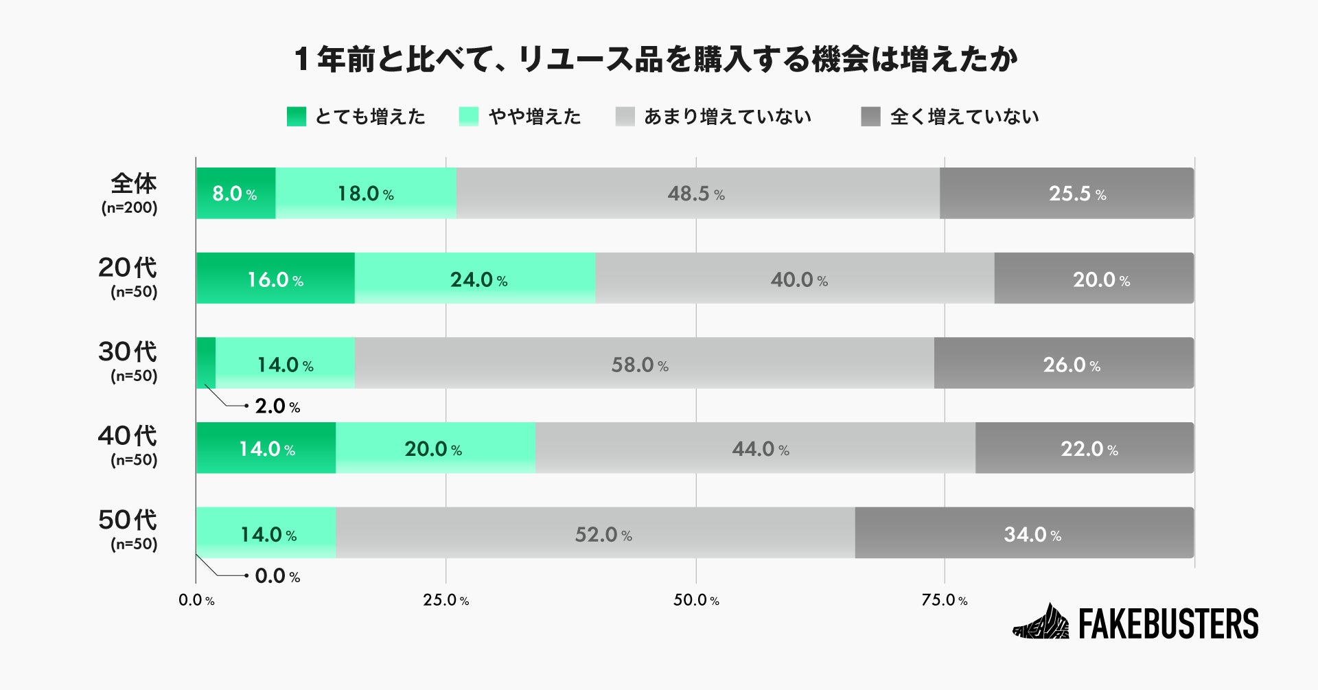 さらに、年代別に見ると、「増えた」と回答した割合は、20代が40.0%、30代が16.0%、40代が34.0%、50代が14.0%と、20代が最も多いことがわかりました(n=200)。