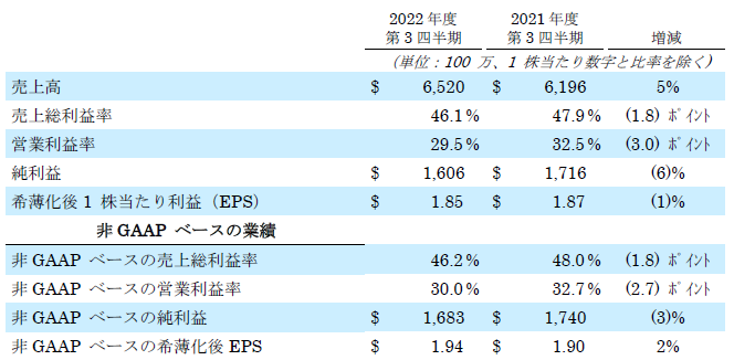 非GAAPベースでは、売上総利益率46.2%、営業利益19億5,000万ドル(売上高の30.0%)、1 株当たり利益1.94ドルでした。