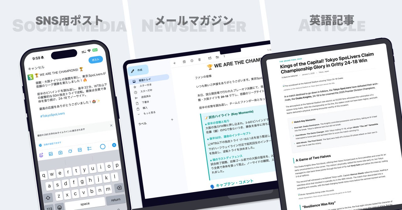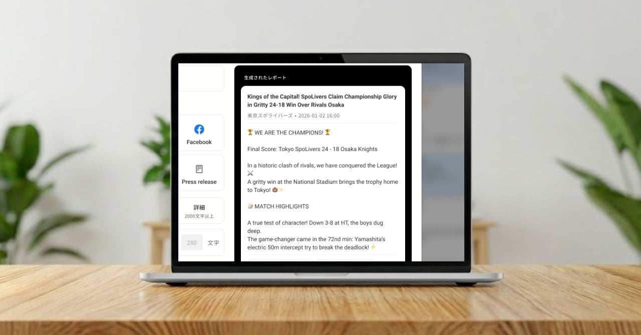 本機能により、スポーツ団体が抱える「情報発信の負担」という課題を解決し、現場スタッフが下書き作成ではなく、ファンとの直接的なコミュニケーション、選手サポート、イベント企画、より深い取材や分析など、創造的で付加価値の高い業務に注力できる環境を創出いたします。結果として、より多くの試合がカバーされ、各記事の質も向上することで、ファンにとってより充実したコンテンツ体験が実現されます。