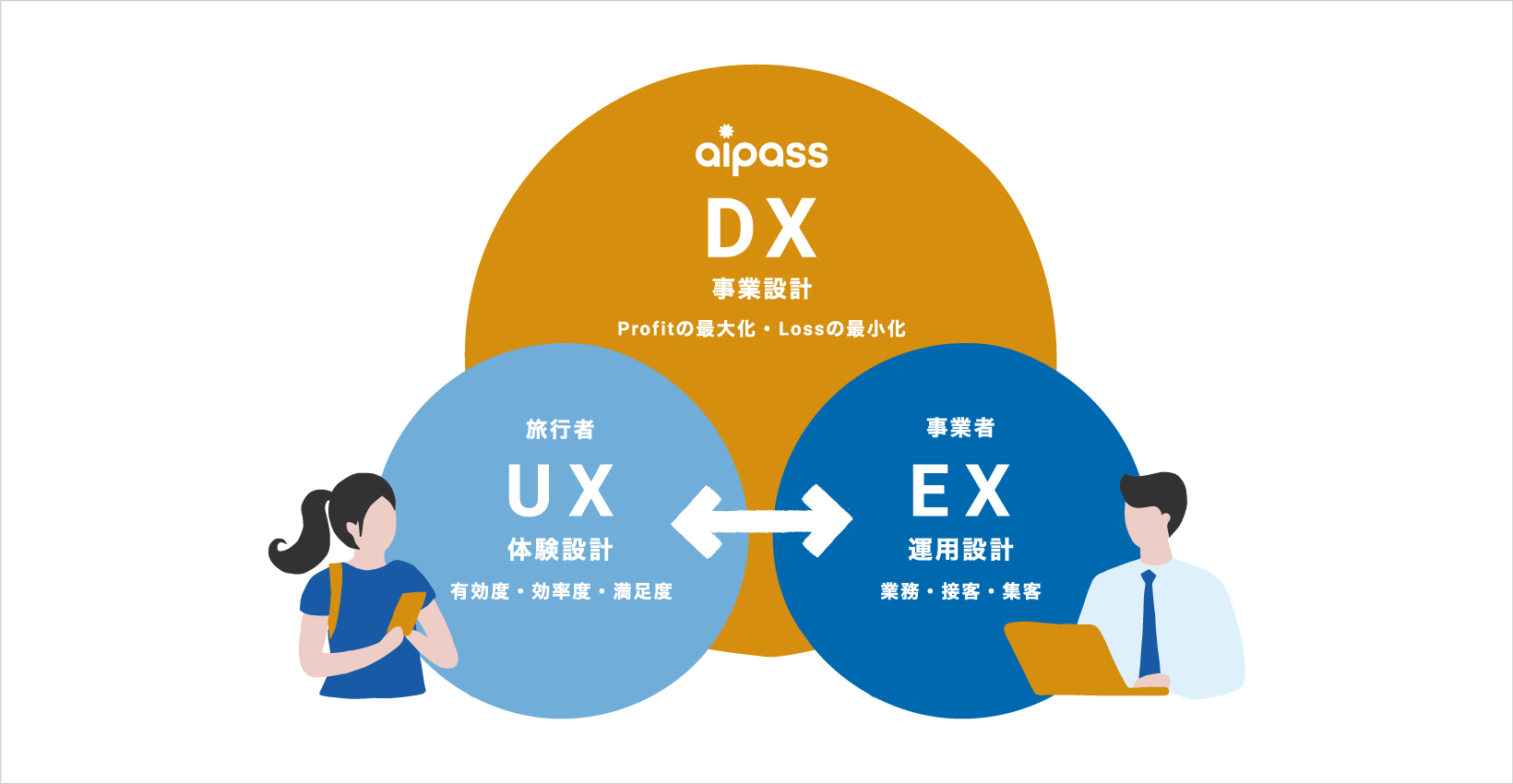 「Experience System(エクスペリエンスシステム)」とは、「UX(旅行者)とEX(従業員)」それぞれの体験を設計し、最適な機能を提供することで、経営課題を解決しDXを実現するシステムです。