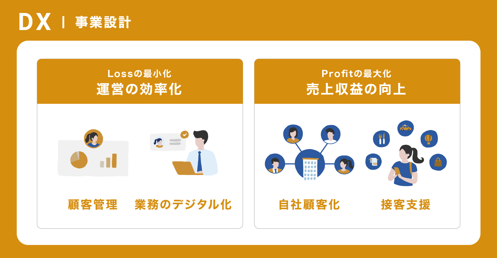 業務のデジタル化など「Lossの最小化(運営の効率化)」と自社集客など「Profitを最大化(売上収益の向上)」することで事業者のDXを支援します。