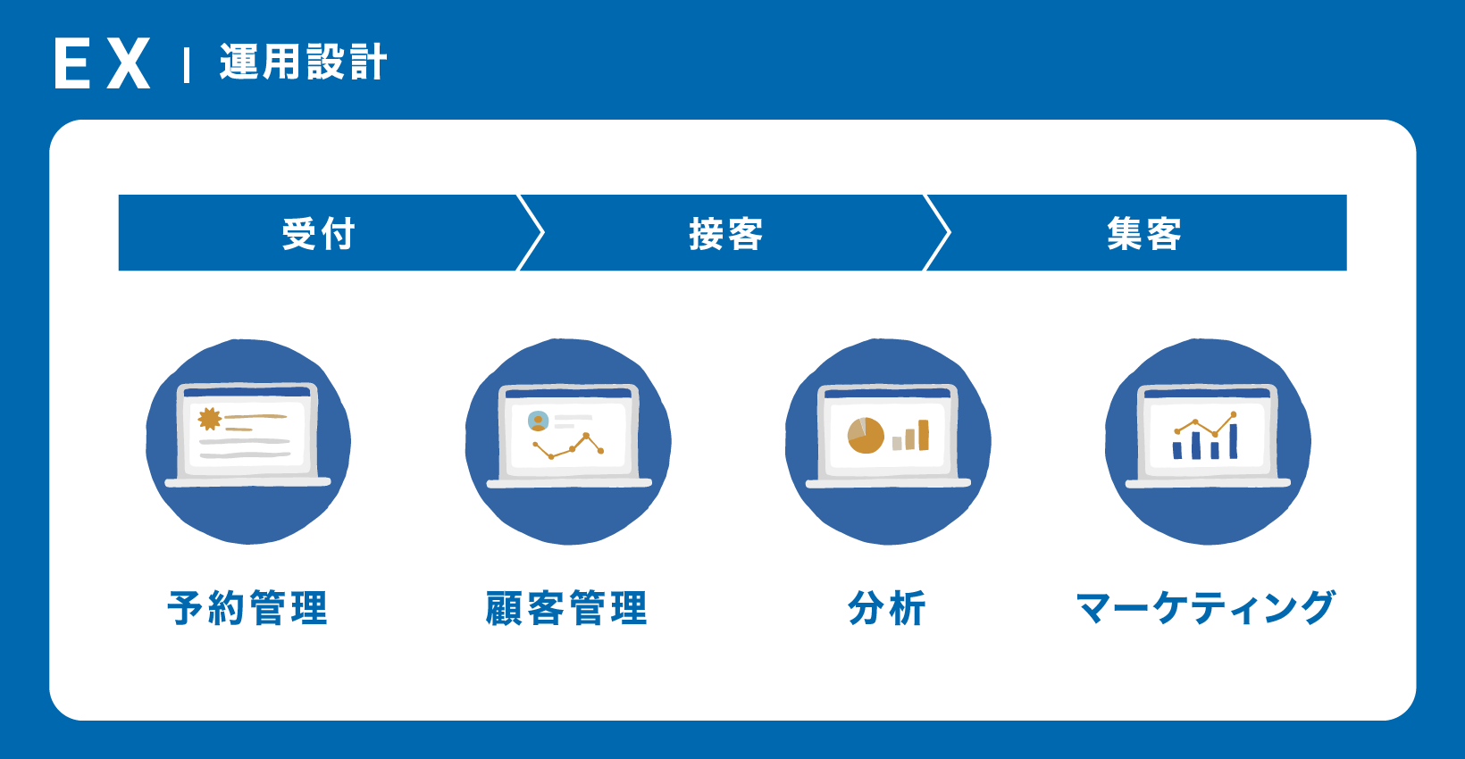事業者が抱える「業務、運用、集客」の課題に対し、EX(Employee Experience)を設計することで、業務効率化や接客力の向上など運用を最適化します。