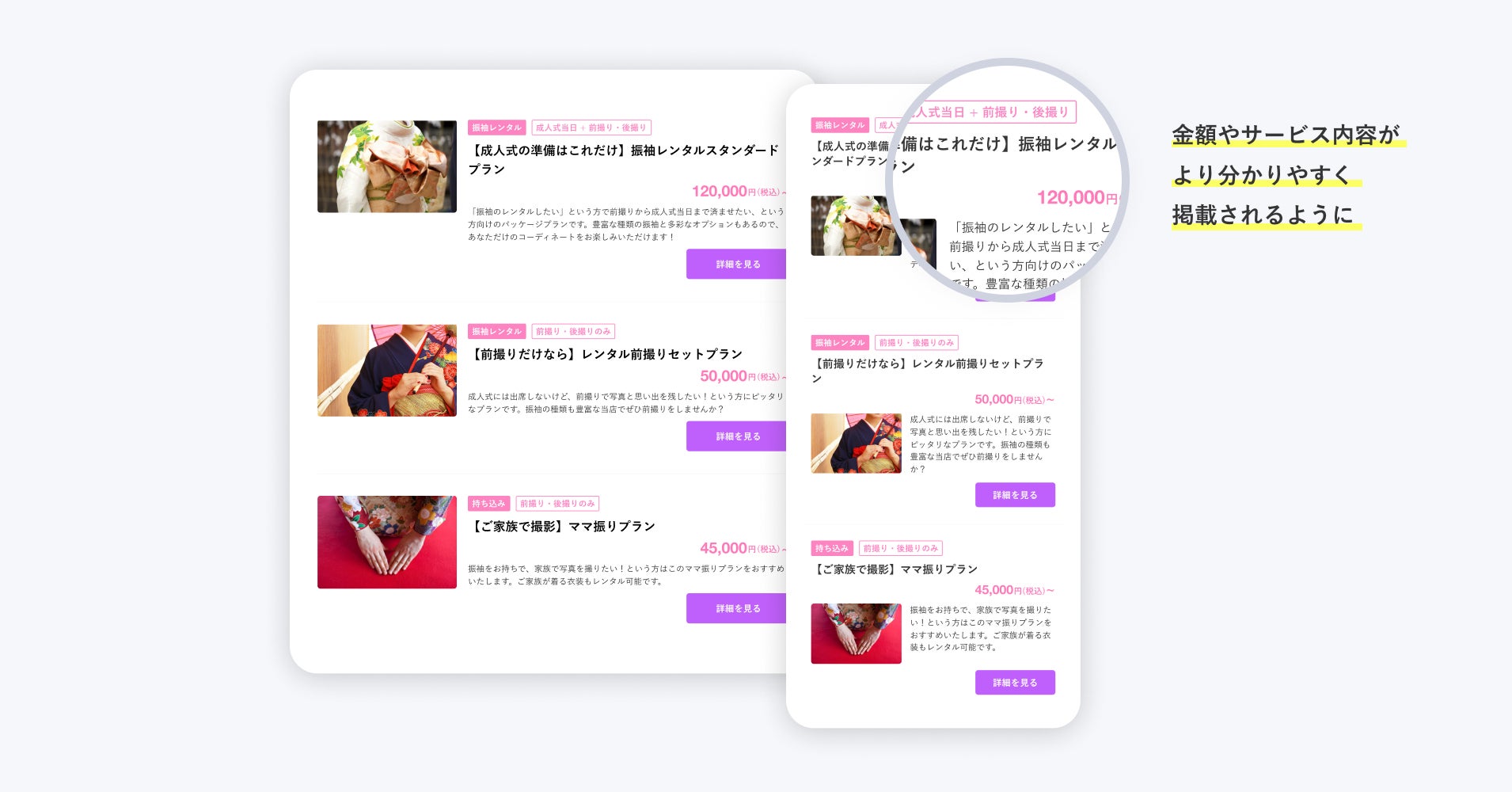 かねてよりMy振袖では、振袖ポータルサイトとして店舗のページや前撮り用のプランとして、「前撮りメニュー」の機能などで店舗の情報提供をサポートして参りました。