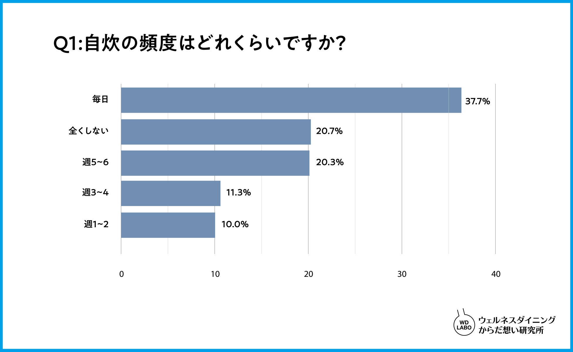 「毎日」と回答した人は37.7%、「週5〜6日」が20.3%となり、合わせて約58%の人が週に5日以上自炊している。一方で、「全く自炊しない」人も20.7%いるなど、多様な食生活が見て取れる。