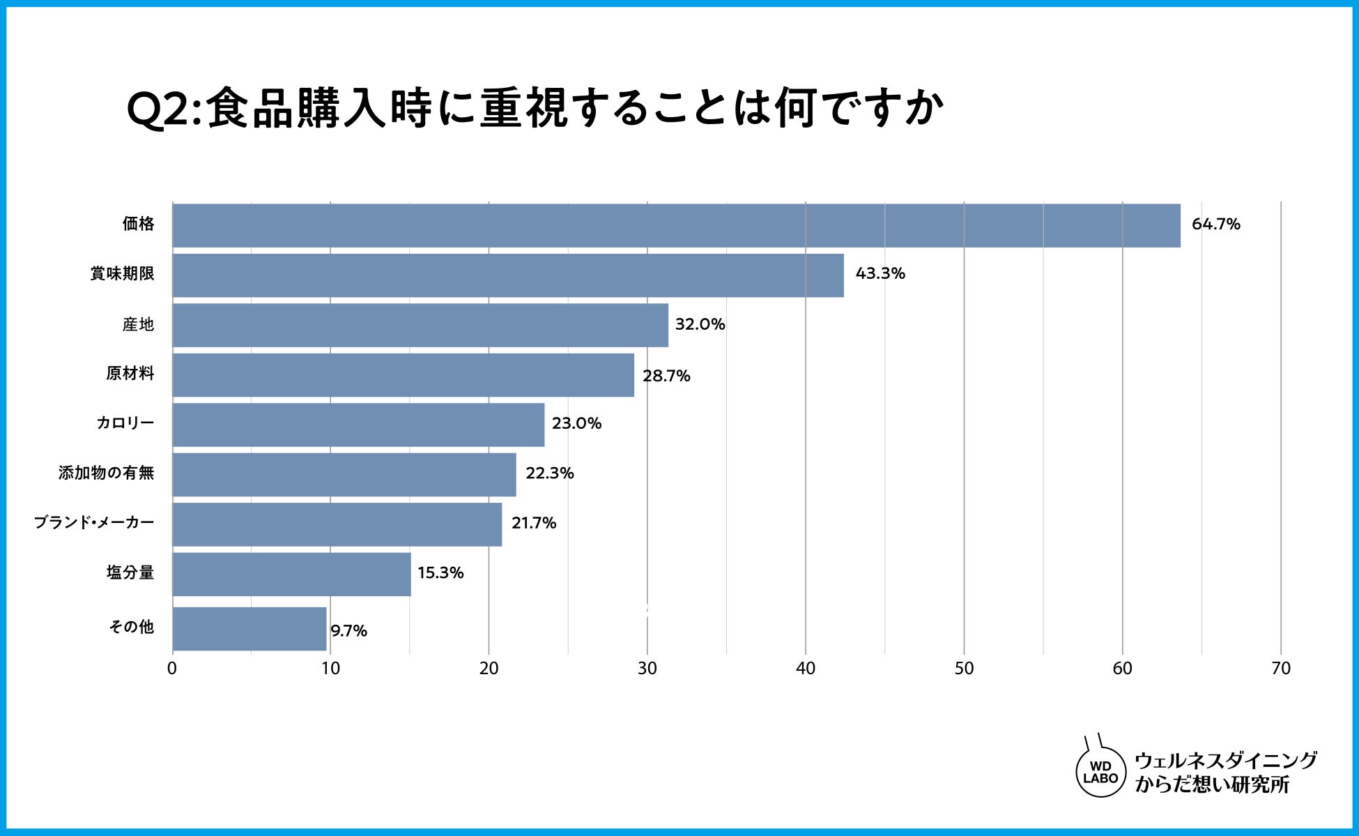 食品購入時に最も重視することとして「価格」が64.7%と圧倒的に多く、次いで「賞味期限」が43.3%となった。これに対し、「塩分量」を重視すると回答した人はわずか15.3%に留まり、消費者が食品の「塩分」をあまり意識していない現状。