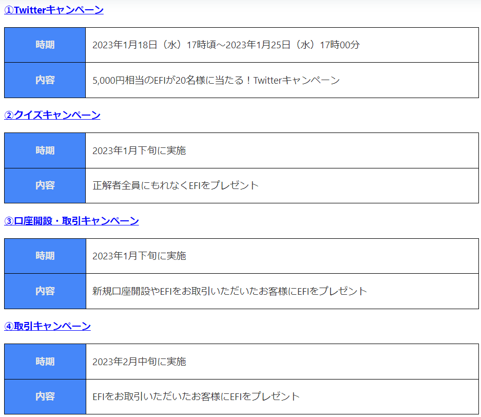また、2023年1月18日時点で、エフィニティトークン(EFI)の取り扱いは国内初となります。(※自社調べ)