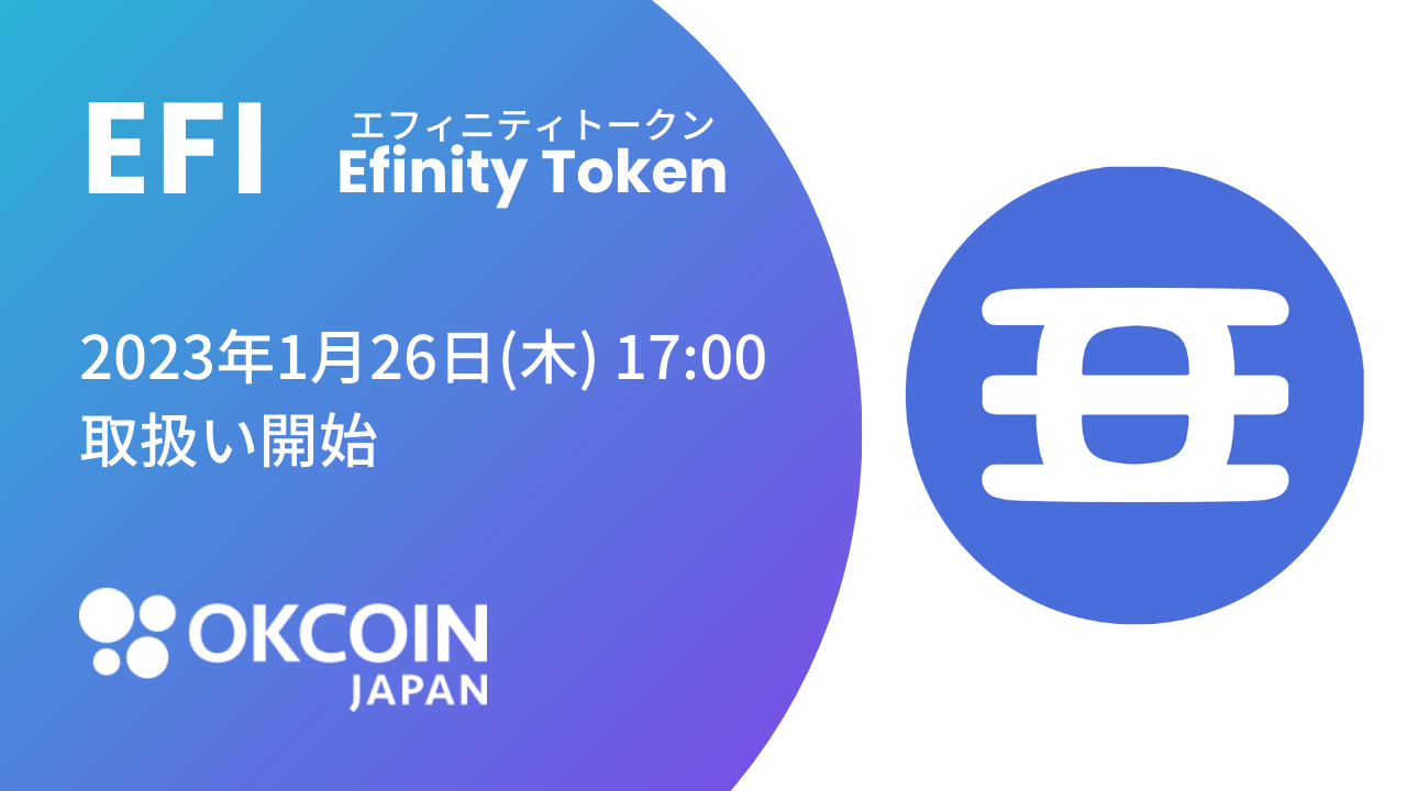 当社は、OKCoinJapan(暗号資産取引所)にて、『エフィニティトークン(EFI)』を、2023年1月26日(木)に取り扱い開始することをお知らせいたします。これにより、OKCoinJapanは、22種類の暗号資産を取り扱うこととなります。
