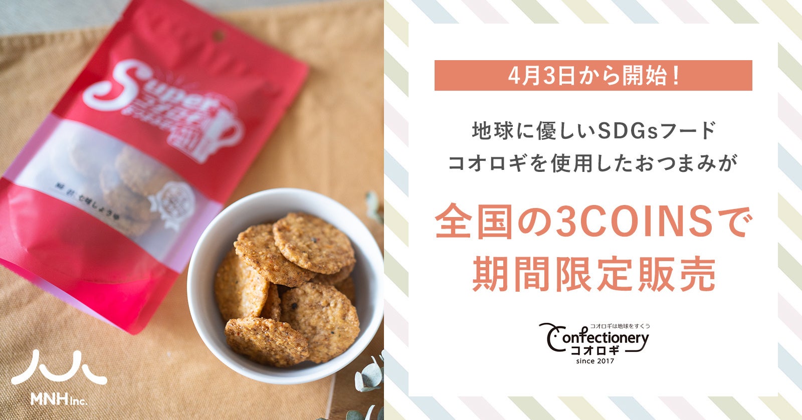 昆虫食の将来性にいち早く注目し、2016年から食用コオロギを使用したお菓子とおつまみの開発を進めてきたMNHの人気商品『コオロギおつまみせんべい』と『未来コオロギオツマミ』が、3COINSの手掛けるサスティナブルな取り組み「TU DU KU(つづく)PROJECT」 の一環として、期間限定で店頭販売されます。