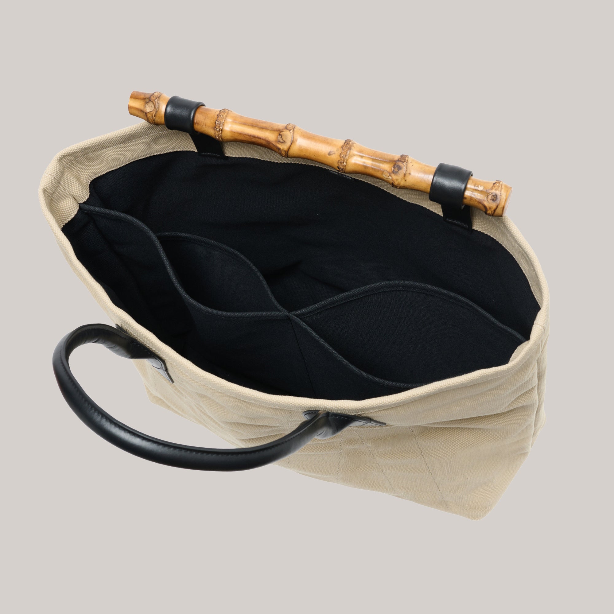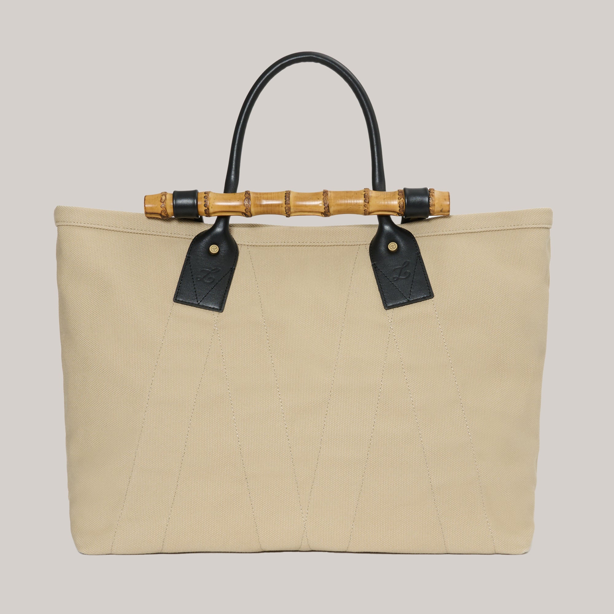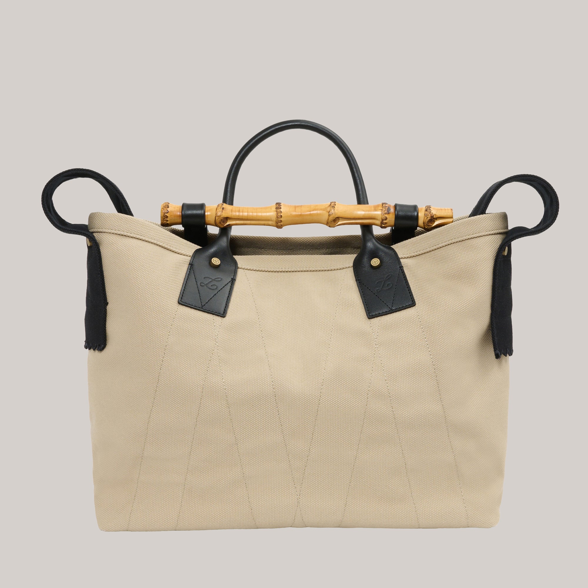 レザーのハンドルは、柔らかくてタッチ感の良い革と布帛のバッグで使用する芯材を合わせました。経年変化を待たず、最初から柔らかな質感で握り心地のよいハンドルです。