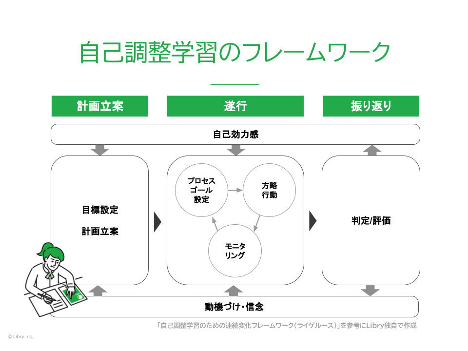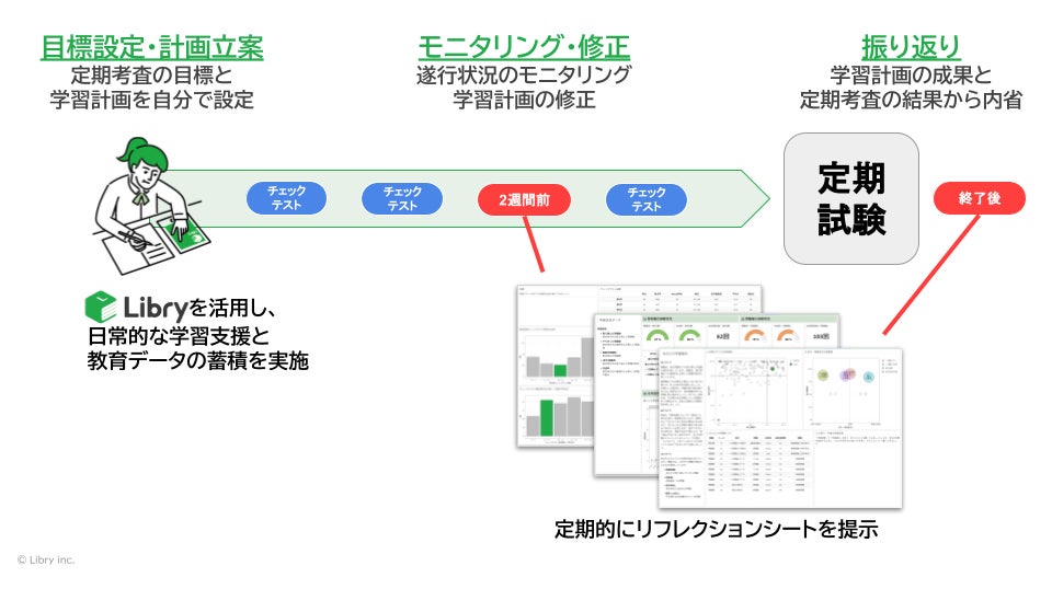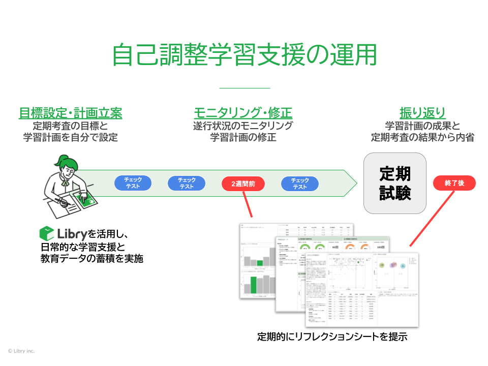 生徒自身で目標を設定し、Libryなどを活用して自由進度で学習を進めます。Libryから得られる日常的な学習記録をもとに作成したリフレクションシートを定期試験2週間前と定期試験後に提示することで学習状況を自覚させ、行動変容を促します。生徒自身が目標設定から実行、計画の修正、振り返りまでを繰り返し行うことで、自己調整学習能力を醸成します。