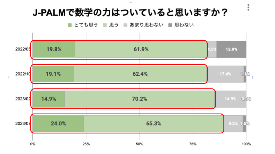 十文字中学校が2022年度入学の生徒を対象に実施したアンケートでは、「J-PALMで数学の力がついていると思いますか?」という設問に対して、4段階のうち、「とても思う」「思う」と回答した生徒の割合が、2022年5月は 81.7%でしたが、段階的に大きくなり、2023年7月には 89.3%と向上しました。この結果から、生徒が取り組みを行う中で徐々に効果を実感できていることが読み取れます。