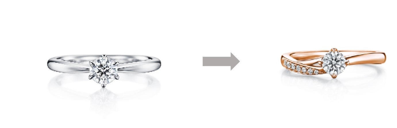 サプライズプロポーズの時に渡した本物の婚約指輪をダイヤモンドはそのままに、サイズ調節はもちろん、違うデザインのリングやネックレスに、心を込めておつくりし直す、理想のプロポーズを叶えるサービスです。