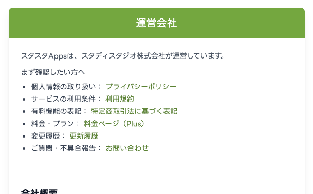 これまでスタスタAppsでは、運営会社情報の確認は会社Webサイトへ遷移していただく形でした。