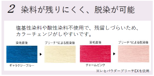 アルカリの配合量を 発色に必要な最低量 に抑えているため、ブリーチ力がなく、毛髪への ダメージを抑制します。