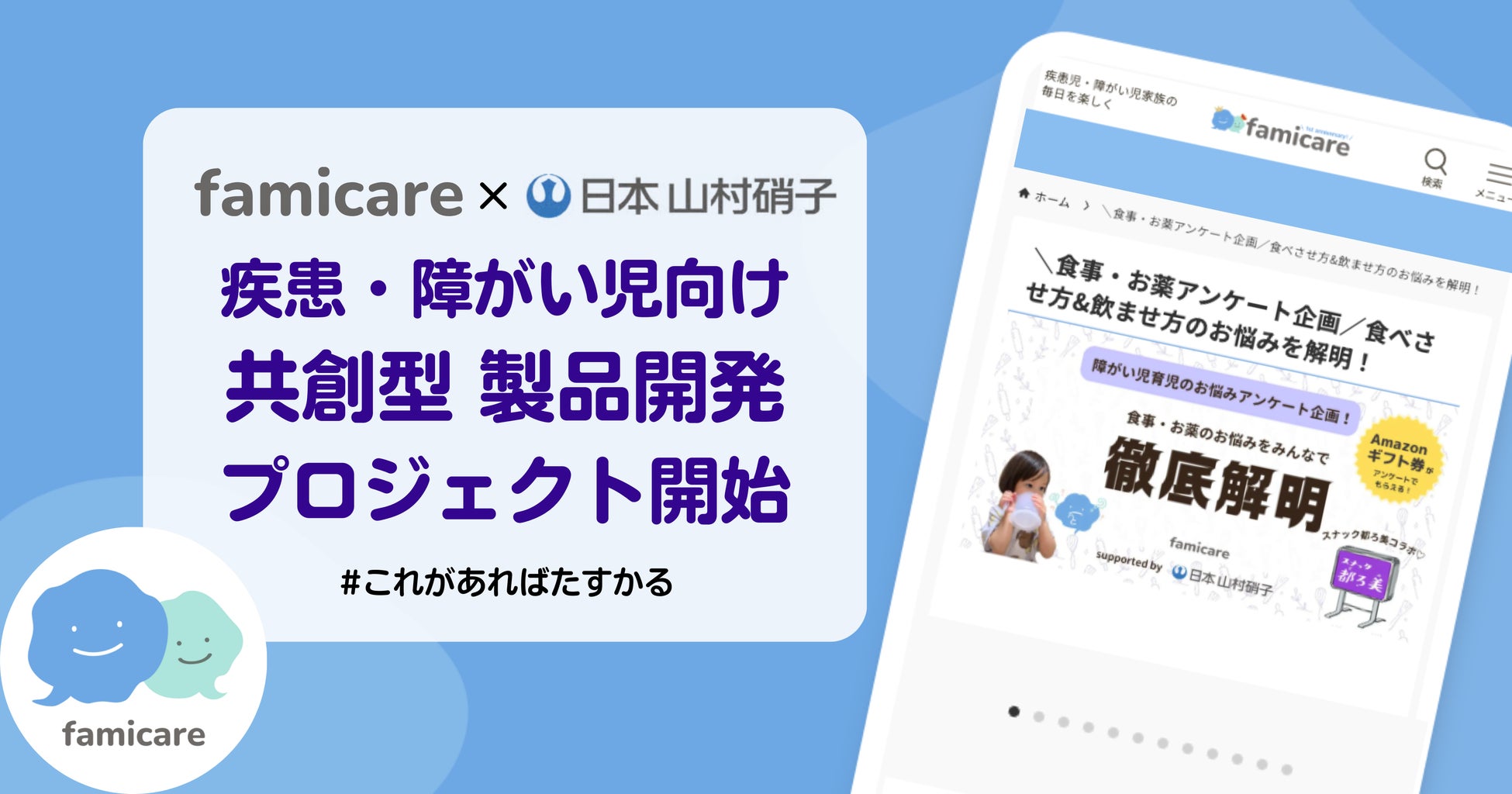 日本山村硝子株式会社(本社:兵庫県尼崎市、代表取締役社長執行役員:山村 幸治、以下 当社)は、株式会社NEWSTA(東京都渋谷区、代表:鈴木碩子、以下 NEWSTA社)が運営する「疾患児・障がい児の毎日を楽しく!」を目指す疾患や障がいなどの特性のある子と家族向け情報サイト「ファミケア」と全国の疾患・障がい児家族と共に製品開発を行う共創型プロジェクトを発足しました。