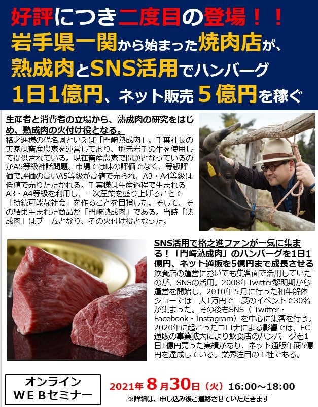 今回セミナーでご講演いただく、熟成肉通販「格之進」様(https://kakunosh.in/)は、2008年Twitter黎明期から運営を開始し、2010年5月に行った和牛解体ショーでは一人1万円で一度のイベントで30名が集まった。その後もSNS( Twitter・Facebook・Instagram)を中心に集客を行う。2020年に起こったコロナによる影響では、EC通販の事業拡大により飲食店のハンバーグを1日1億円売った実績があり、ネット通販年商5億円を達成している。