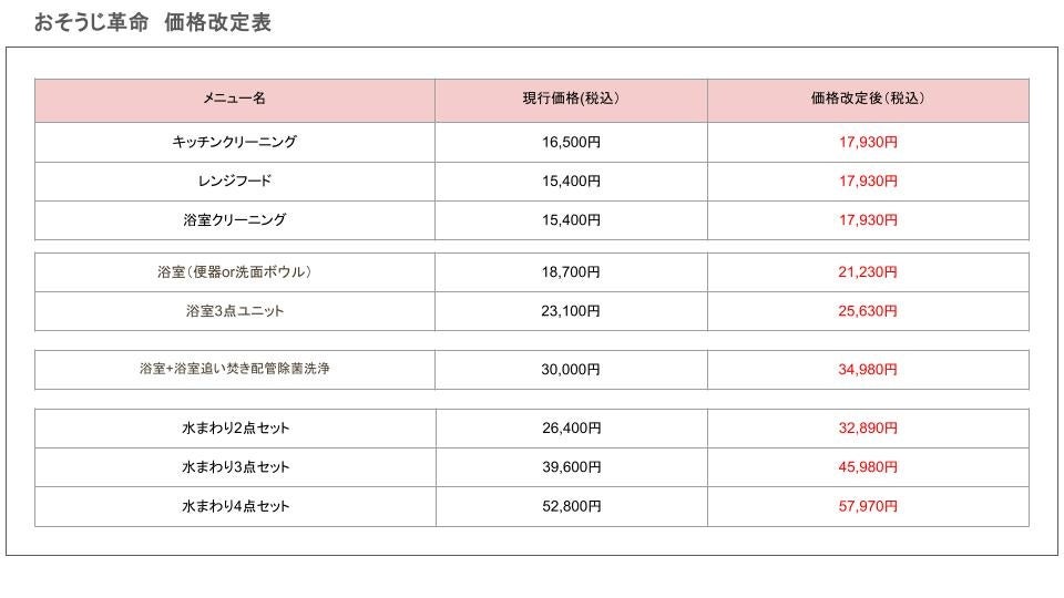 『おそうじ革命』 一部サービスの価格改定のお知らせ