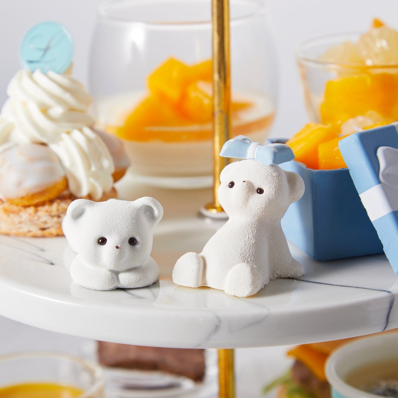 純白に変身したテディベア“ヌーミー”と“エイミー”が彩る、ブルーをテーマにした優雅なアフタヌーンティー。