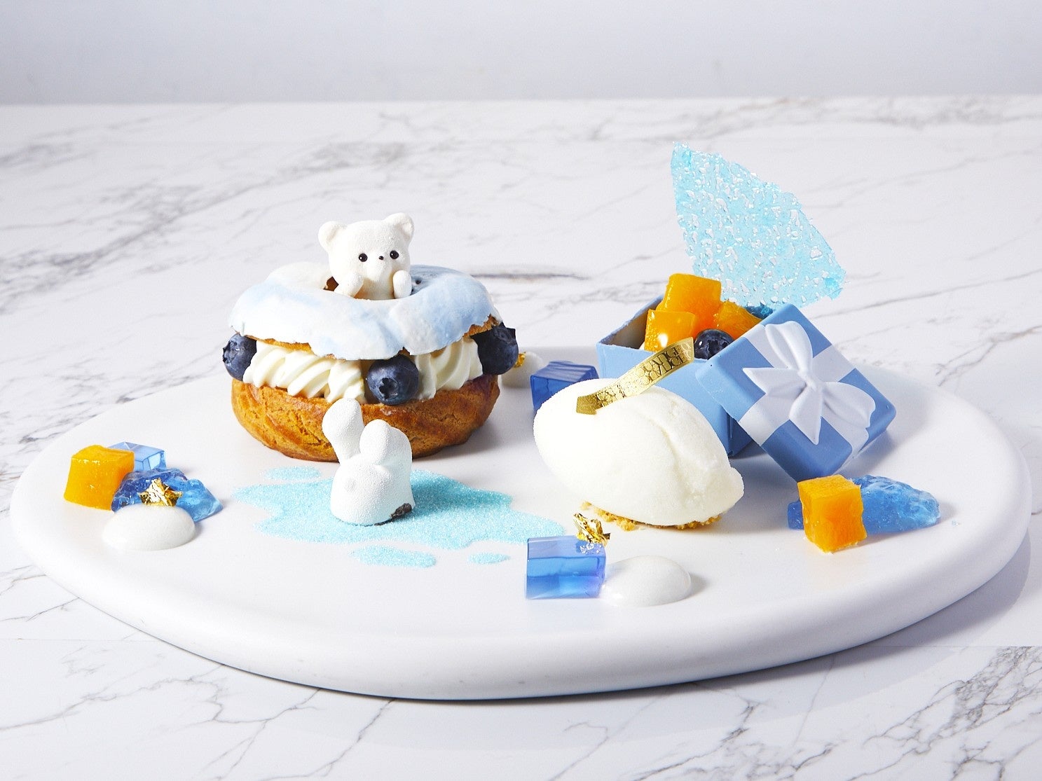 パリ・ブレストを主役に据えたデザートプレートは、ブルーベリーソースの深い甘みと酸味が織りなす味わいを、軽やかなクリームと香ばしいシュー生地が引き立てます。プレート上には、南国の陽射しを思わせるマンゴーと涼やかなソルベ、そしてバタフライピーの青が美しいゼリーを並べ、まるで絵画のような色彩美を表現。パリ・ブレストから飛び出す純白のテディベア“ヌーミー”が愛らしい逸品。