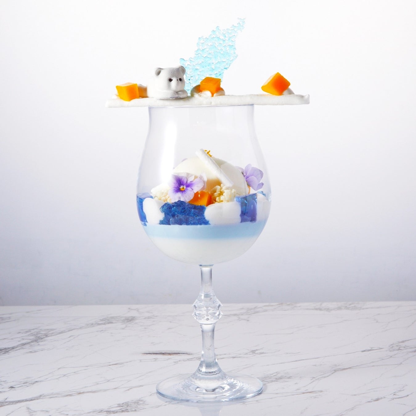 バカラグラスに仕上げた贅沢なブルーパルフェ。ヨーグルトムース、バタフライピーのブルーパンナコッタとジュレ、爽やかなレモンを重ね、ホワイトチョコやスポンジ、季節のフルーツで華やかに仕上げました。青と白のコントラストが織りなす、まるで宝石箱のようなパルフェは、口に運ぶたびに異なる食感と香りが重なり、至福の時間へと誘います。