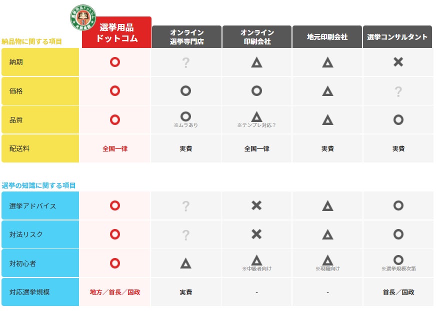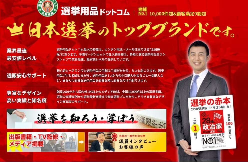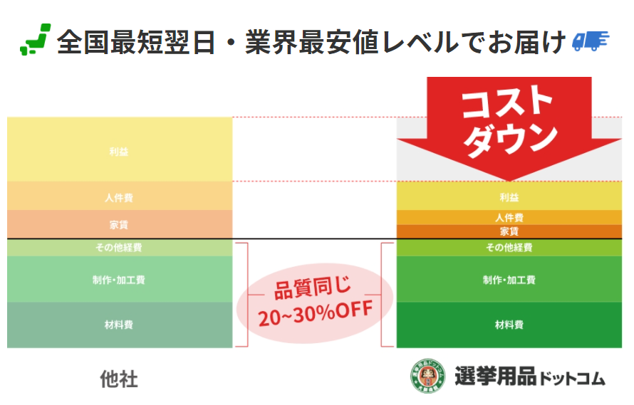 選挙グッズ・選挙用品のリーディングカンパニーとして、 全国通販・業界最速・業界最安値レベルを実現。