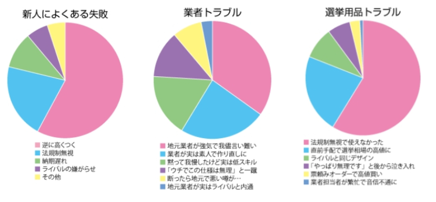 慣れない業者に注文したので、何がどれだけ必要か分からず、土壇場での買い忘れが発覚。結局、その選挙用品の発注を断念、使用することができず、大きな穴をあけてしまった。