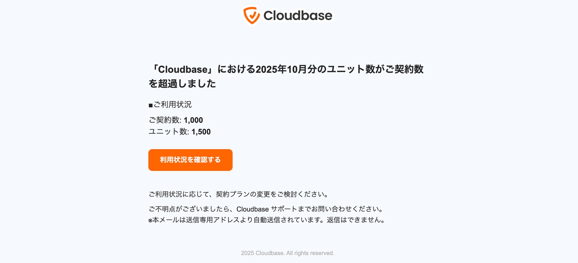 ※3 毎月5日の午前10時に、前月分のユニット数が超過した場合のみ、当該組織内のオーナー権限を持つユーザーに通知メールが配信されます。