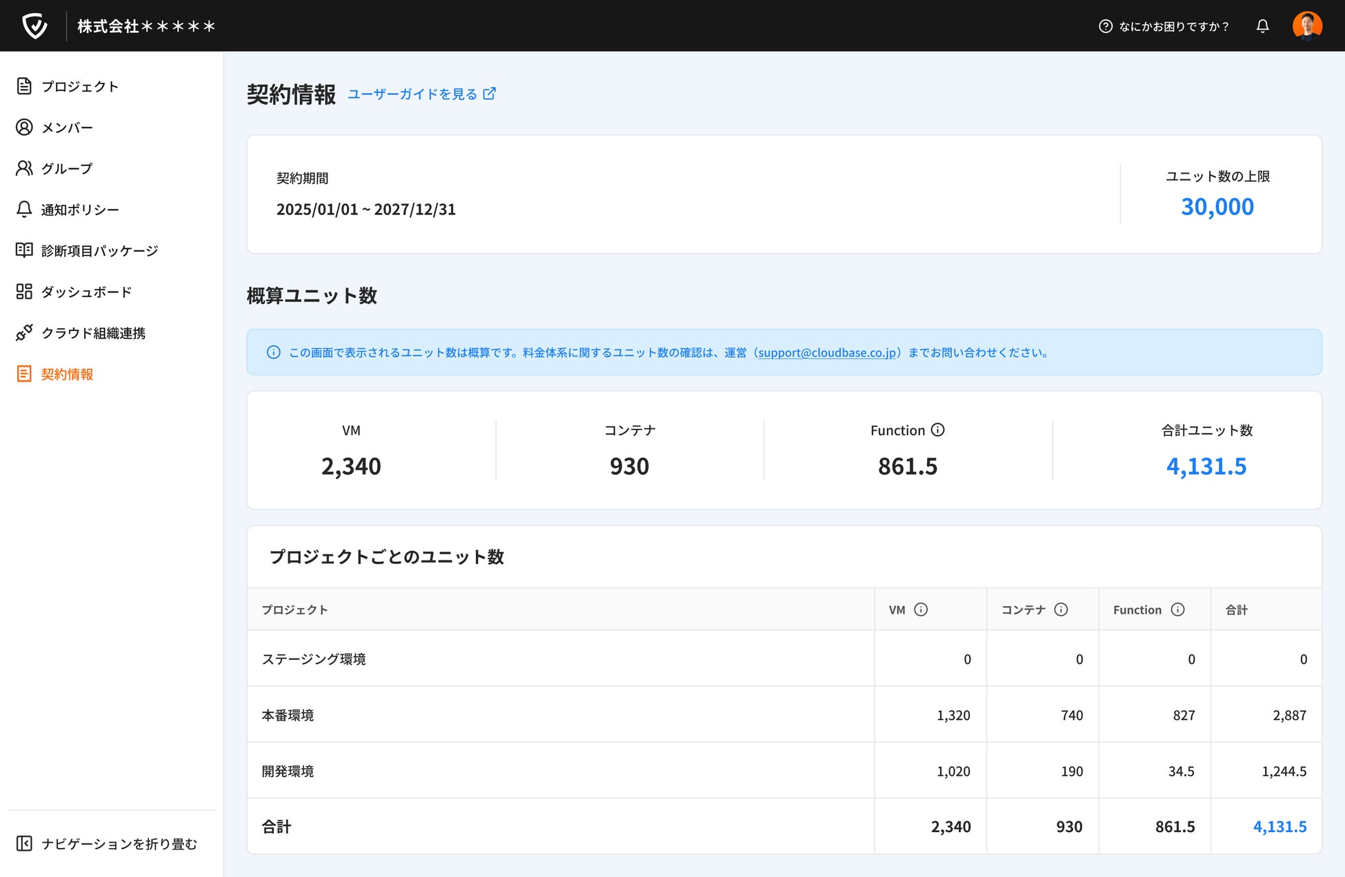 これまでの「契約情報」画面では、各プロジェクトの最新のスキャン結果をもとにした「概算ユニット数」を一覧でご確認いただけるのみとなっており、料金算出の基準となるユニット数については、弊社運営まで別途お問い合わせいただく必要がありました。そのため、ご利用いただいている皆さまには、これまで以上にスムーズに管理いただけるよう、今回のリリースにより、プロダクト上からユニット数も直接ご確認いただけるようになりました。これにより、契約情報をより正確かつスムーズにご確認いただけるようになります。なお、これまで通り、最新のスキャン結果も引き続きご覧いただけます。