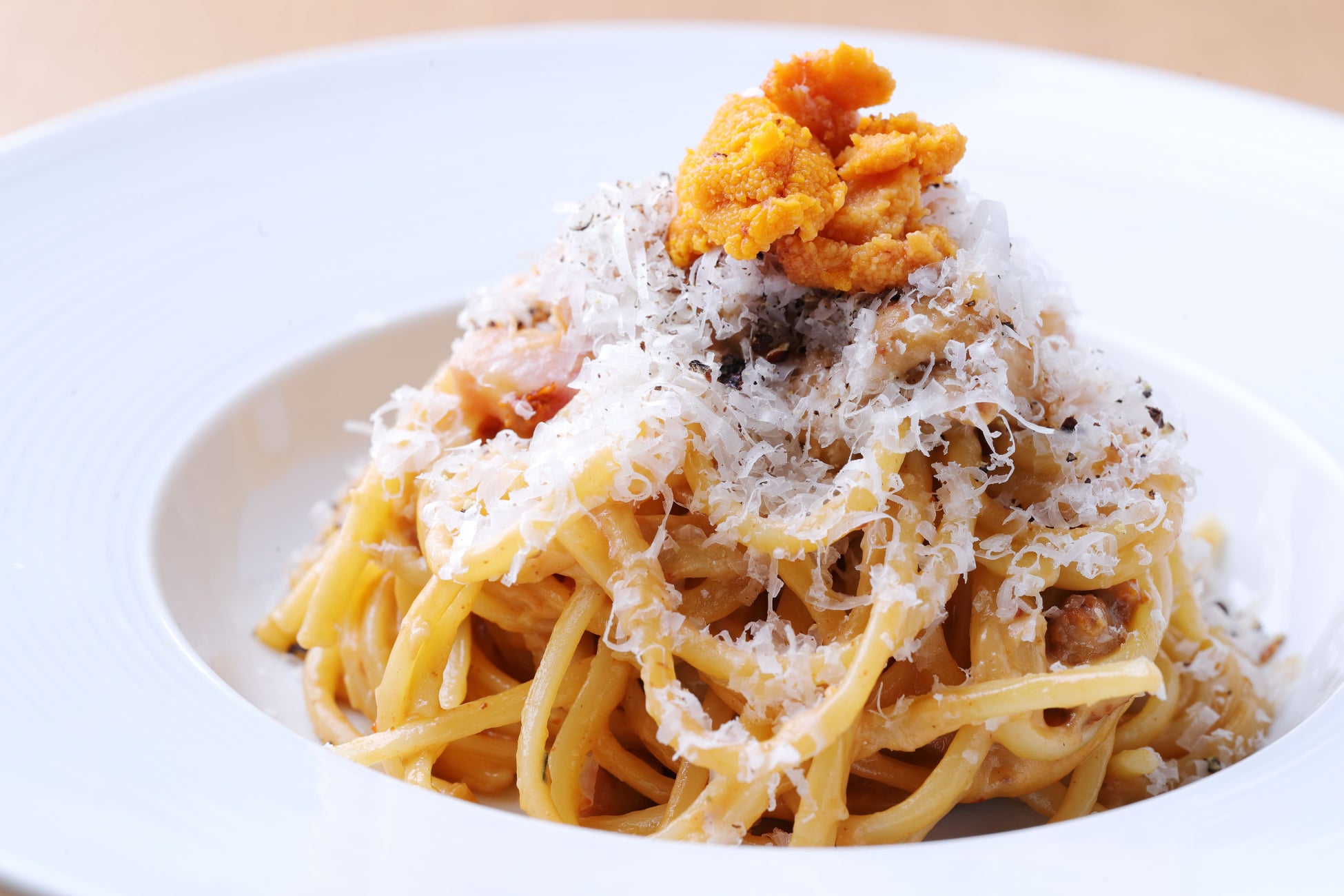 カルボナーラのソースに雲丹をふんだんに使い贅沢に仕上げました。 見た目からは想像出来ない雲丹の味がお口に入れた瞬間に広がります! 上からペコリーノ・ロマーノを削り乗せています♪