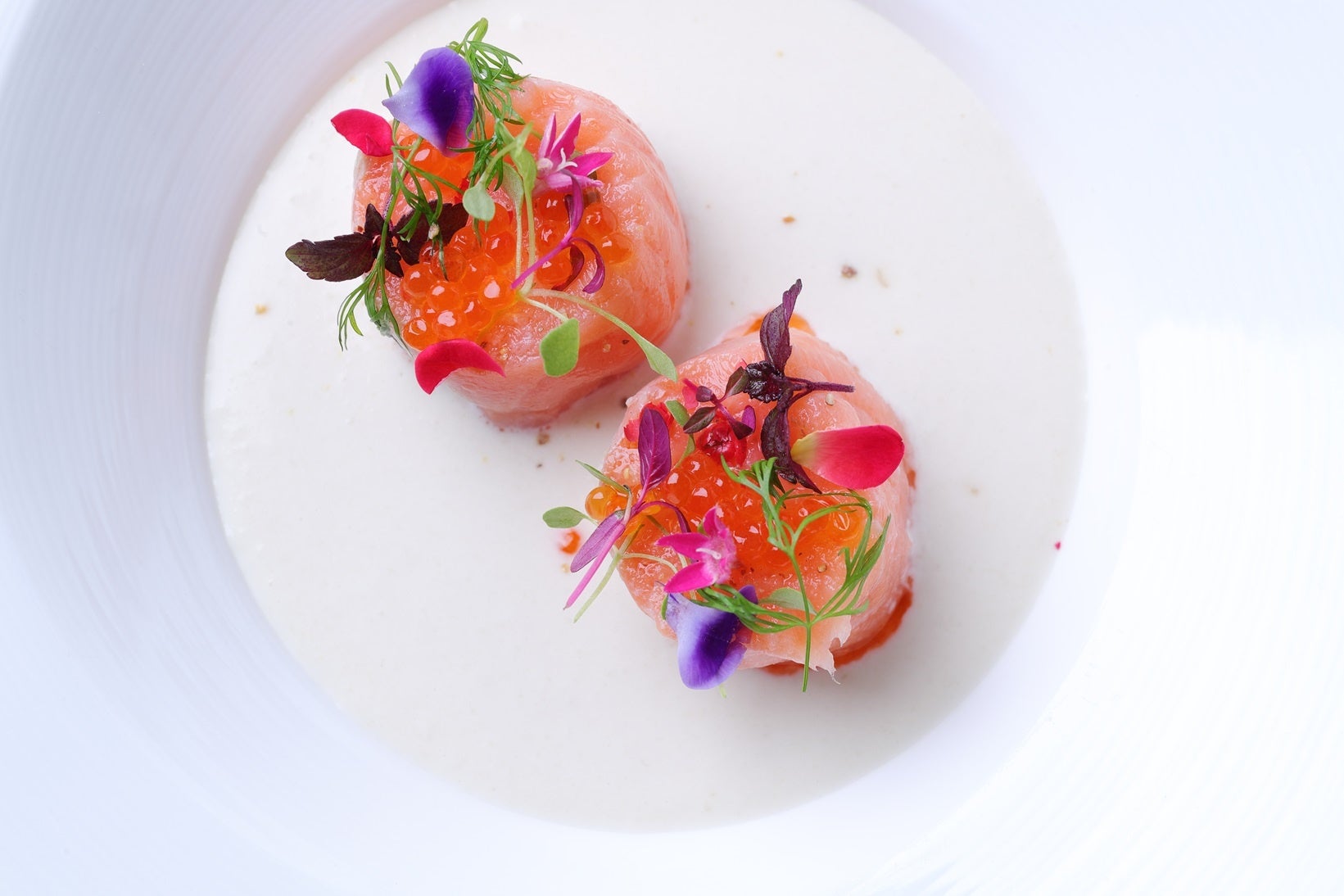 サーモンのミ・キュイ 玉ねぎのブルーテ 赤キャビアを添えて