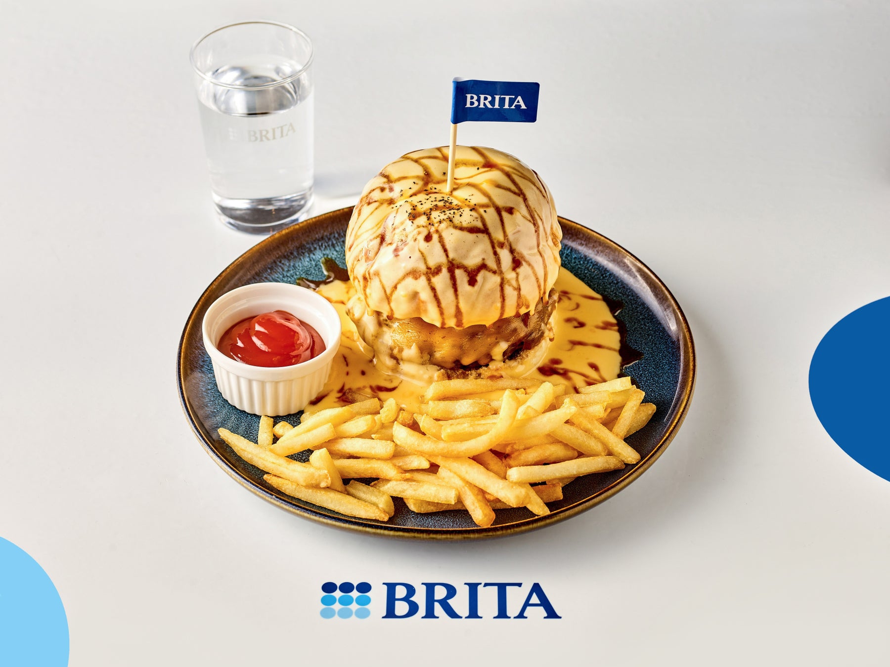 そんな空間の中で提供されるのが、“水がおいしく飲める”をテーマにした限定コラボメニューです。濃厚な味付けが水のおいしさを引きたてる看板バーガーをアレンジした「テリヤキバターチーズメルトバーガー」、ブリタの水で調理した「スープカレー」、スパイスが効いていて水が欲しくなる「汁なし担々パスタ」の3品を楽しんでいただけます。